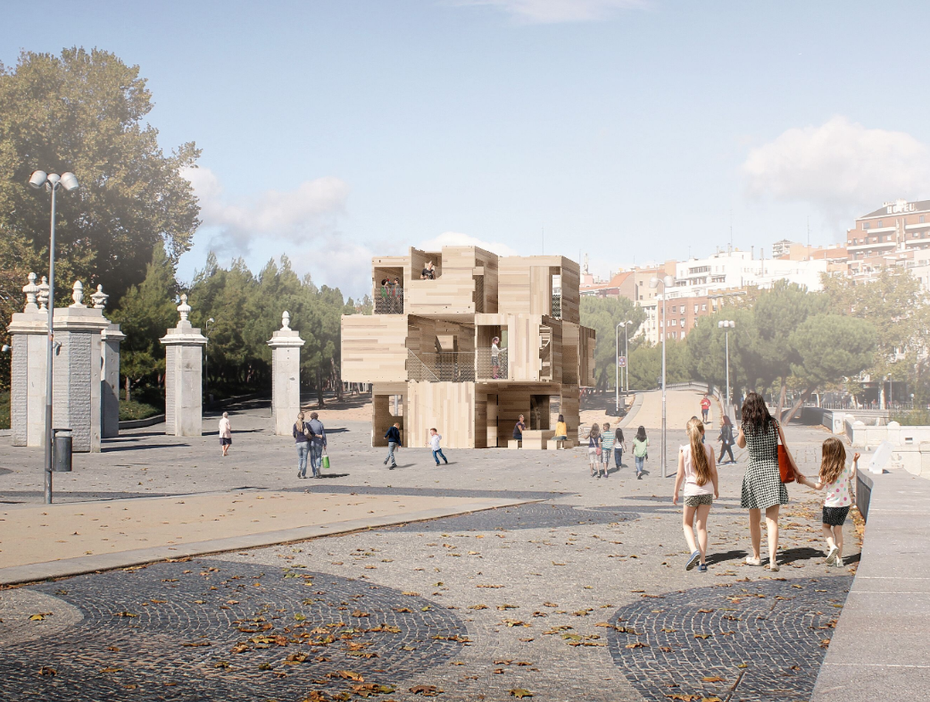MultiPly is comprised of a maze-like series of interconnected spaces that overlap and intertwine. It has been conceived and constructed to encourage visitors to re-think the way we design and build our homes and cities. The three-dimensional structure is constructed from a flexible system of 12 CLT modules of American tulipwood with digitally manufactured joints, as if it were a piece of furniture ready to assemble. Because it is composed of modules, the construction can be disassembled and reassembled. It was first shown as part of London Design Festival in 2018, in the Sackler Courtyard of the Victoria and Albert Museum, outside the Building Centre in London with New London Architecture, and then at the Universite deglie Studi di Milano, as part of Interni’s ‘Human Spaces’ exhibition at Milan Design Week 2019, and is presented here in Madrid for its fourth iteration.