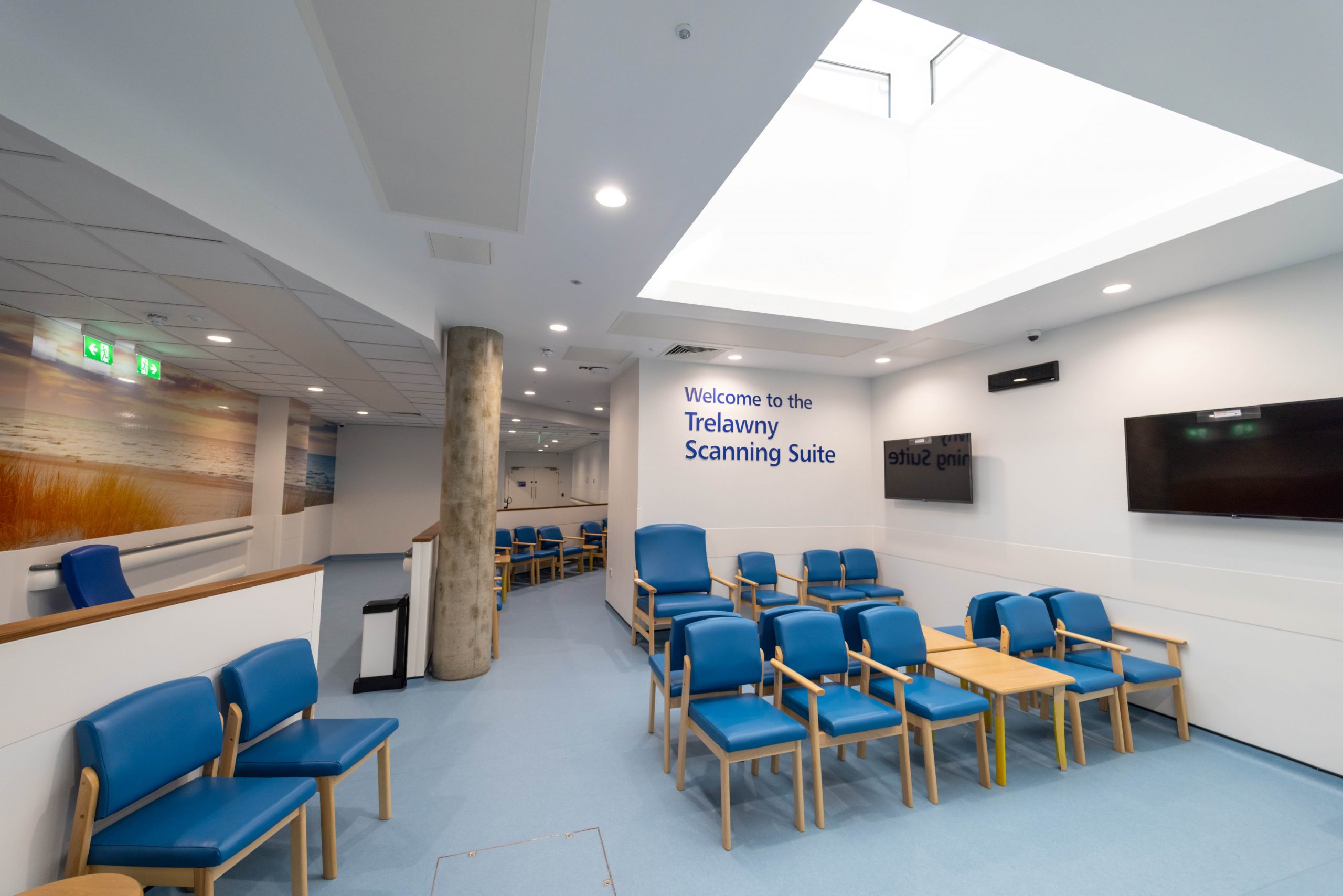 The stunning reception and waiting area is spacious and welcoming with a floor to ceiling mural and a dedicated waiting area for children, complete with an interactive play mat. The new reception also supports the existing, adjoining CT scanning department located right next door – bringing all the Trelawny Wing imaging services together.