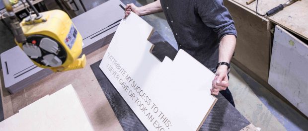 The white desk, made from riga and valchromat, has been designed with homeworkers in mind. To keep them positive during the current pandemic, Alex has engraved each desk with a quote from Florence Nightingale: “I attribute my success to this: I never gave or took an excuse.”