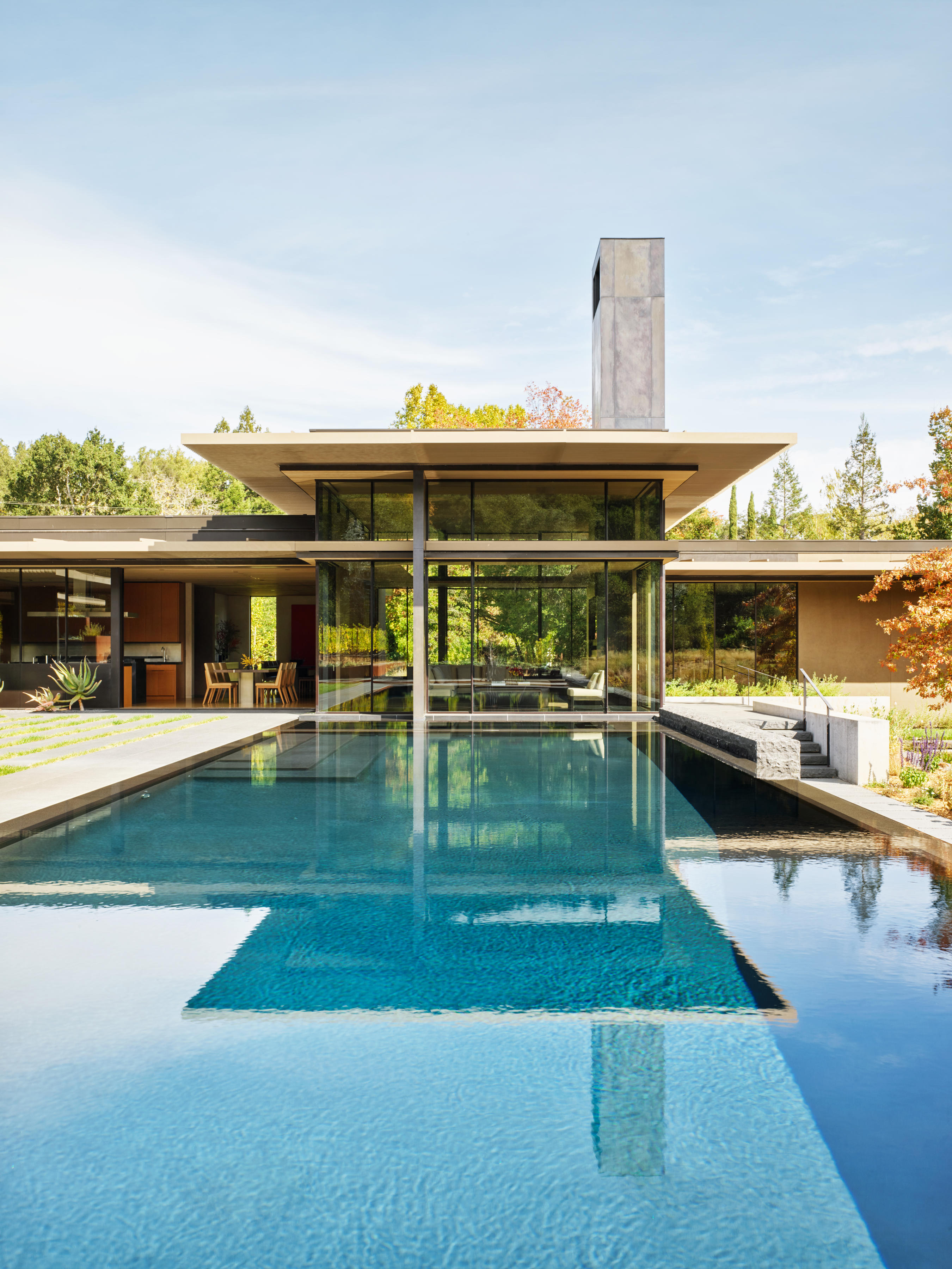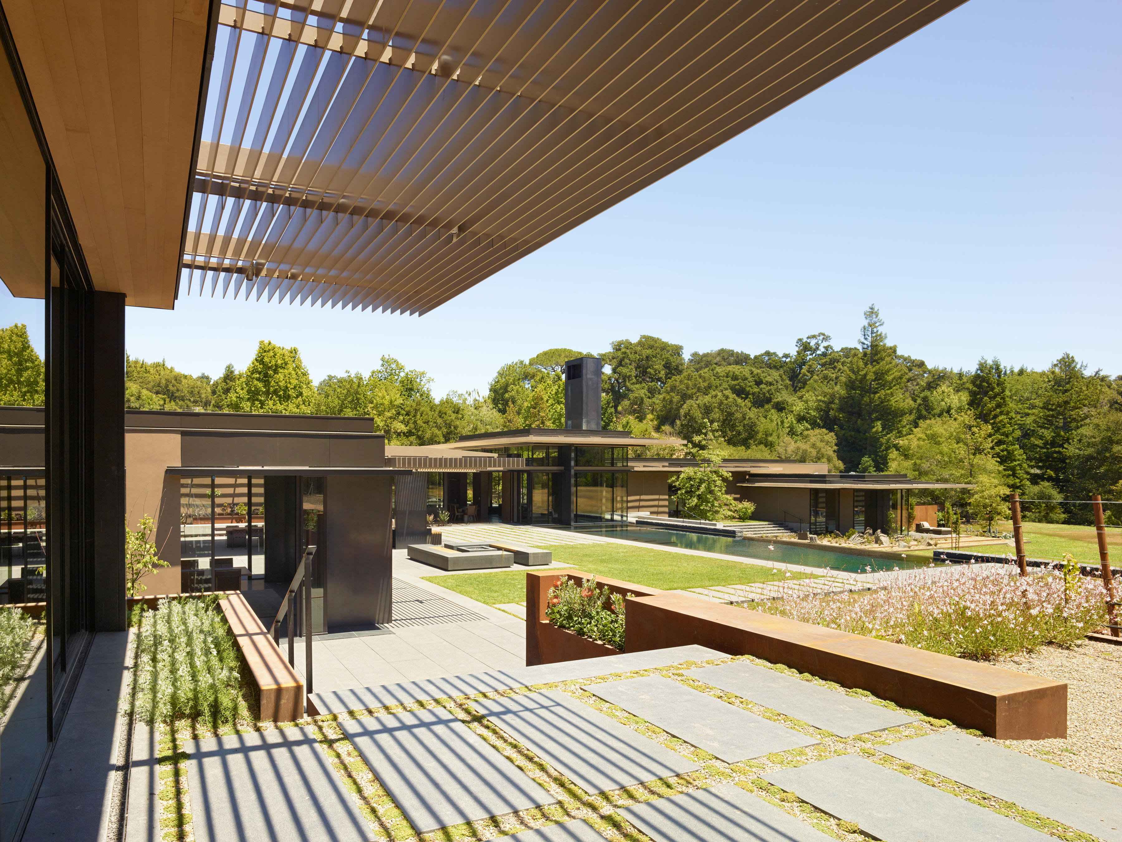 The other side of the site, delineated by an infinity pool and gentle slope, opens into uncultivated meadow space. This more “wild” half of the site contains the private areas of the home, including the master suite, office, and three children’s bedrooms. On both sides of the site, a fluidity between inside and outside defines the built environment. Retracting window walls – including a U-shaped window around the dining pavilion that lowers completely into the ground – open much of the home to nature, maximizing outdoor living possibilities and natural ventilation. Trellises weave over these spaces, providing shade from the California sun and further blending the home into the landscape.
