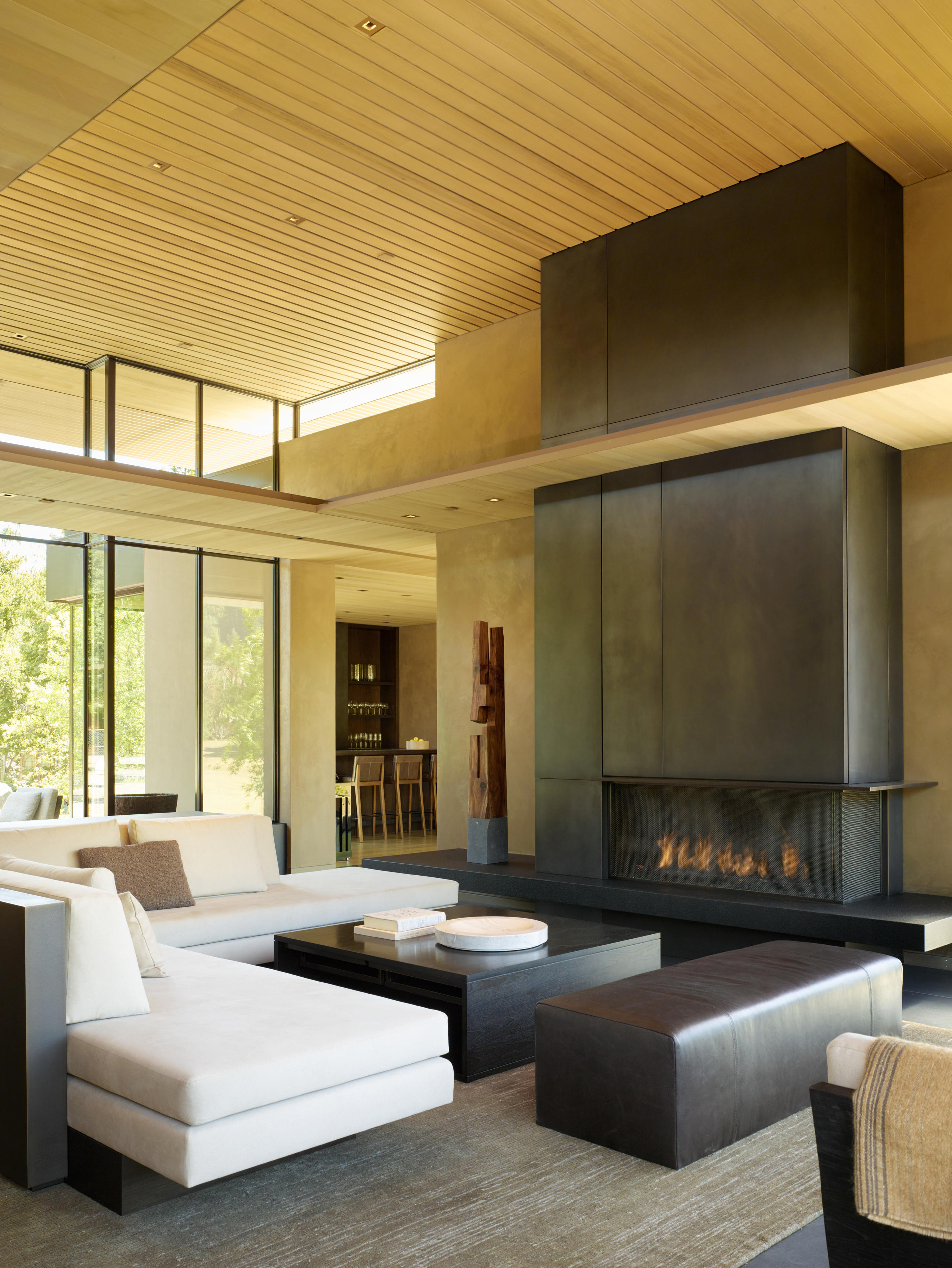 An earthy exterior palette of patinated bronze, black granite, and dark wood inspired by the California woodland setting continues inside the home, where a collection of custom furniture and lighting designed by Jim Olson integrates with the interior environment. Olson also helped to curate an international contemporary art collection for the owners of the home, complementing its architectural expression. Designed to produce as much energy as it uses, the home incorporates several high-performance systems, including solar panels covering over half of the roof area, and geothermal and hydronic heating and cooling systems. The result is a home integrated with nature, not only philosophically and visually, but from a practical perspective as well.