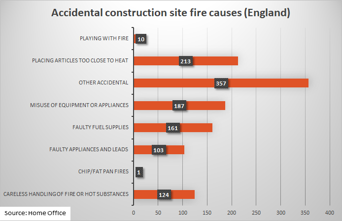 The above graph shows the specific actions that make up the accidental causes of fires on construction sites. These causes can be reduced over time by ensuring that those who work on construction sites undertake appropriate training.