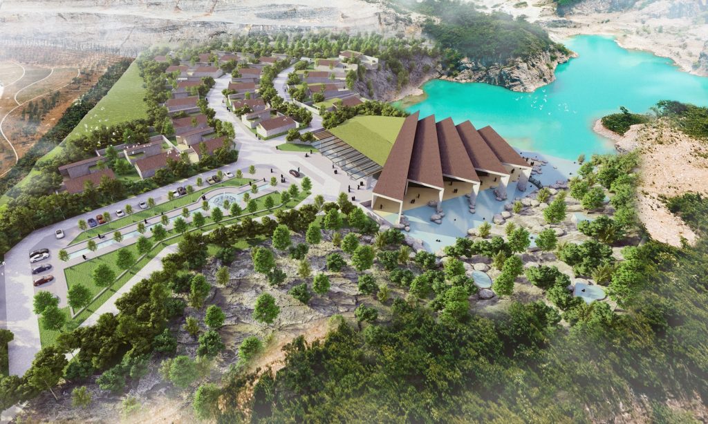The masterplan will see the redevelopment of a large, former quarry site, which spans 530 acres. The development brings together a wide range of elements, with the construction of a hotel, reception building, hilltop villas, and clifftop bar, all centred around a blue water lake, alrady well underway.