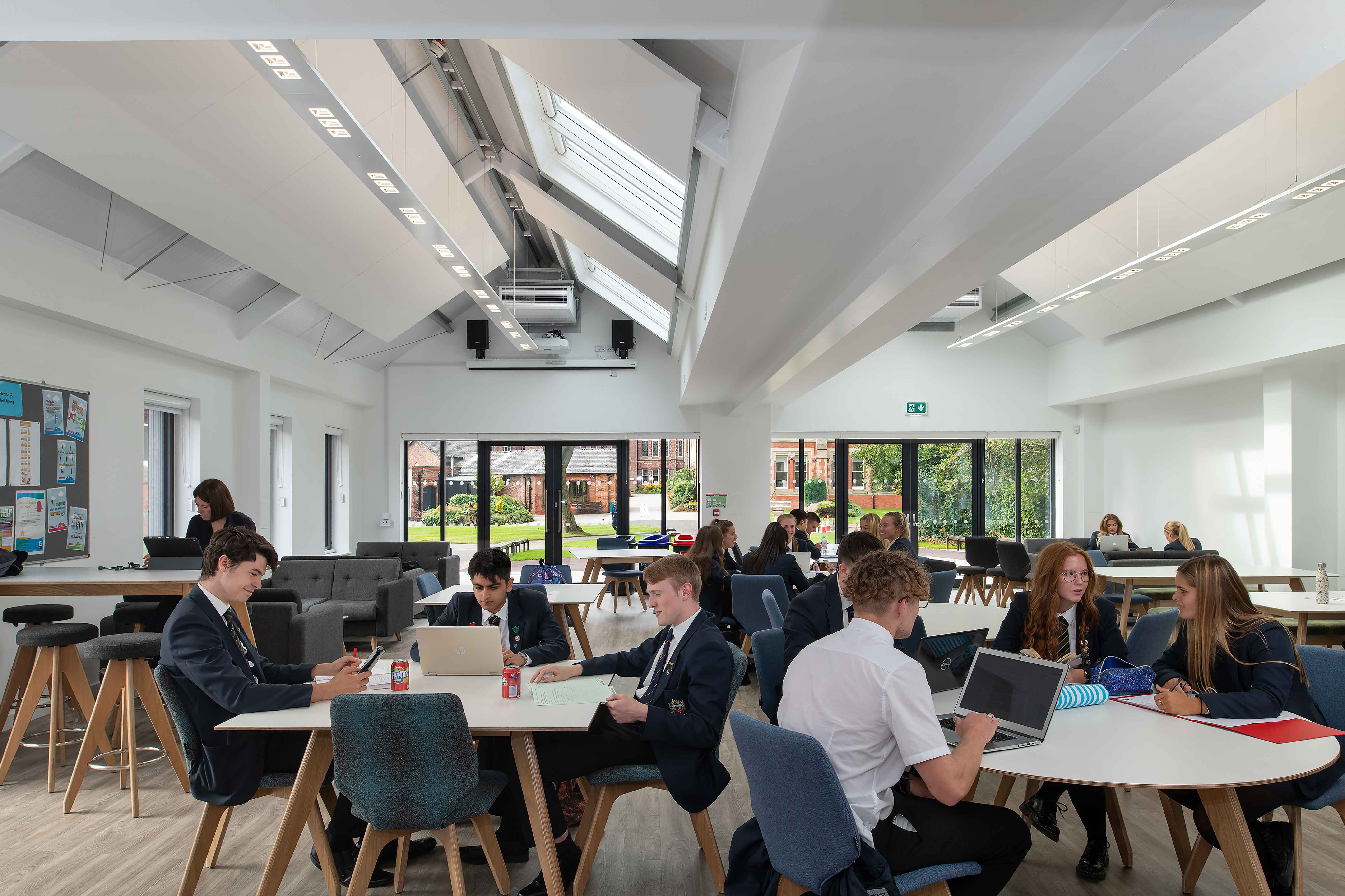 “For the first time in the school’s 163-year history, our Sixth Form students have their own dedicated space, tailored to the needs of our senior learners and designed with their future work experiences in mind. Students can study independently or collaborate with others in the various spaces upstairs, whilst enjoying the comforts of a cafe and social space downstairs.
