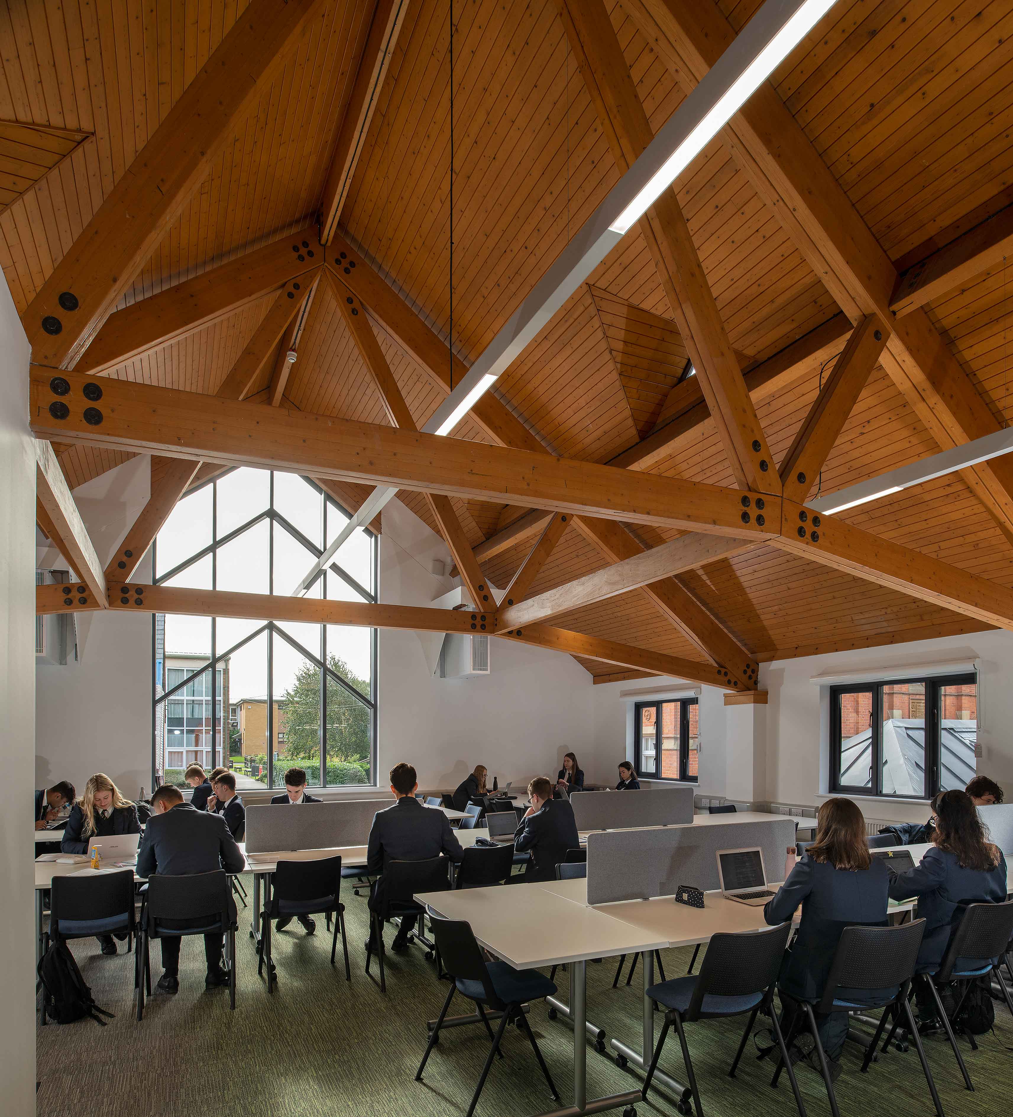 “For the first time in the school’s 163-year history, our Sixth Form students have their own dedicated space, tailored to the needs of our senior learners and designed with their future work experiences in mind. Students can study independently or collaborate with others in the various spaces upstairs, whilst enjoying the comforts of a cafe and social space downstairs.