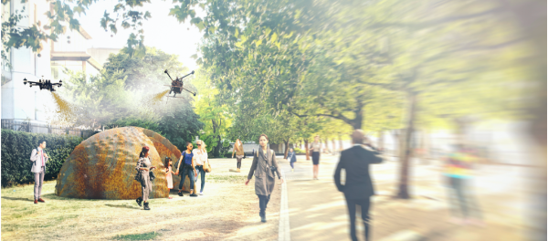 Led by architect Stephanie Chaltiel, the project aims to build a simple but sturdy and durable housing system that can be customised depending on the location. Stephanie has developed a unique digital tool that can be piloted or programmed to “Drone Spray” natural materials over a light prefabricated framework until it forms an inhabitable structure.