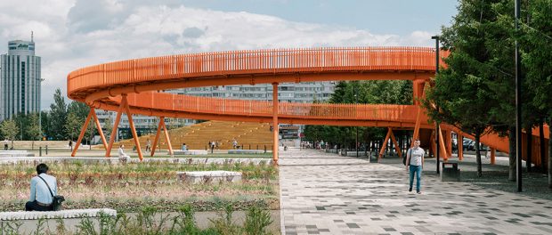 In dialogue with the Promenade, each square is energized by an anchor programme: the amphitheatre doubles as a cafè; the spiral viewing platform, which is painted in the emblematic orange Kamaz color, adds a vertical dimension; and the circular pool transforms into an ice-skating rink in winter.