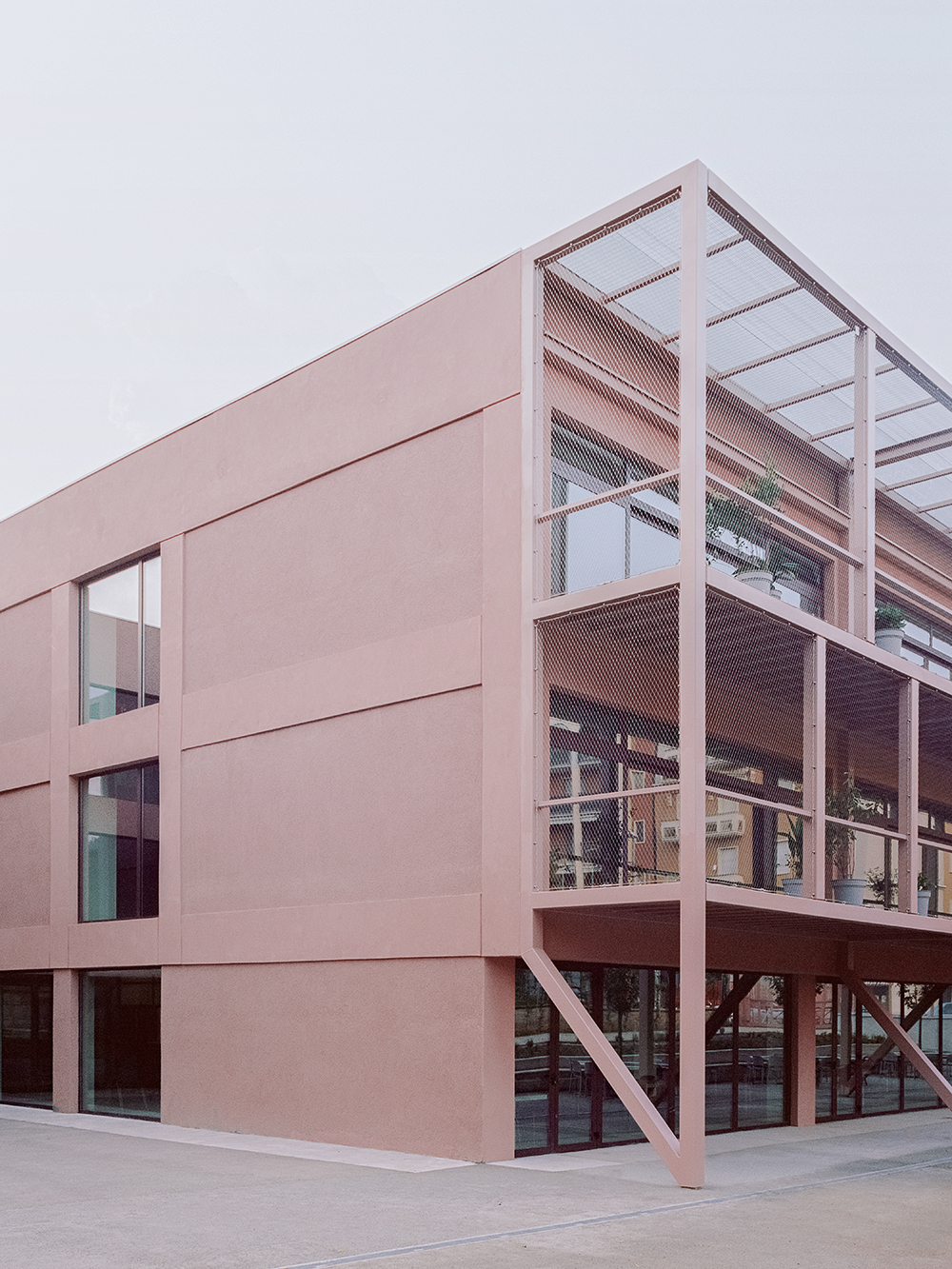 BDR bureau mainly operates by addition: a new steel structure creates an inhabited envelope where the terraces are an integral part of the teaching program, embraces new connective spaces and works as a passive shield. The modularity of the new frame outlines a thread-like backbone, completed by a metal net that highlights the visual permeability and the relationship with the outside.