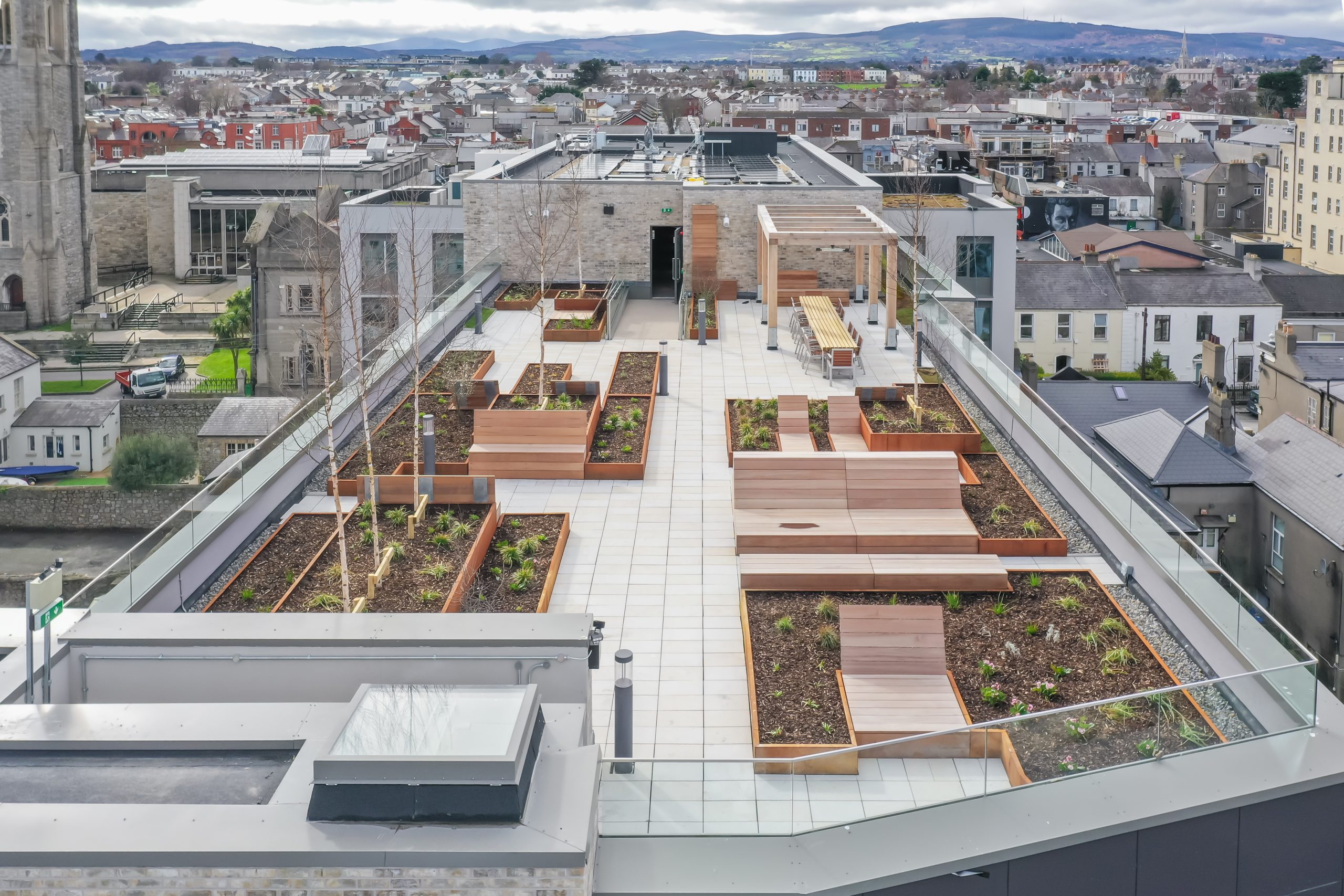 Located on Eblana Avenue, Dun Laoghaire, Dublin the development with 204 beautifully designed and fully serviced studios benefits from a broad range of on – site facilities creating a new community in the established town centre of Dun Laoghaire.  Shared amenities for residents include a stunning sky garden at roof level, while each floors benefits from a MasterChef kitchen relaxation and living spaces. There is also a laundry room, gym and fitness club, cinema, and games room together with workspace and meeting rooms.