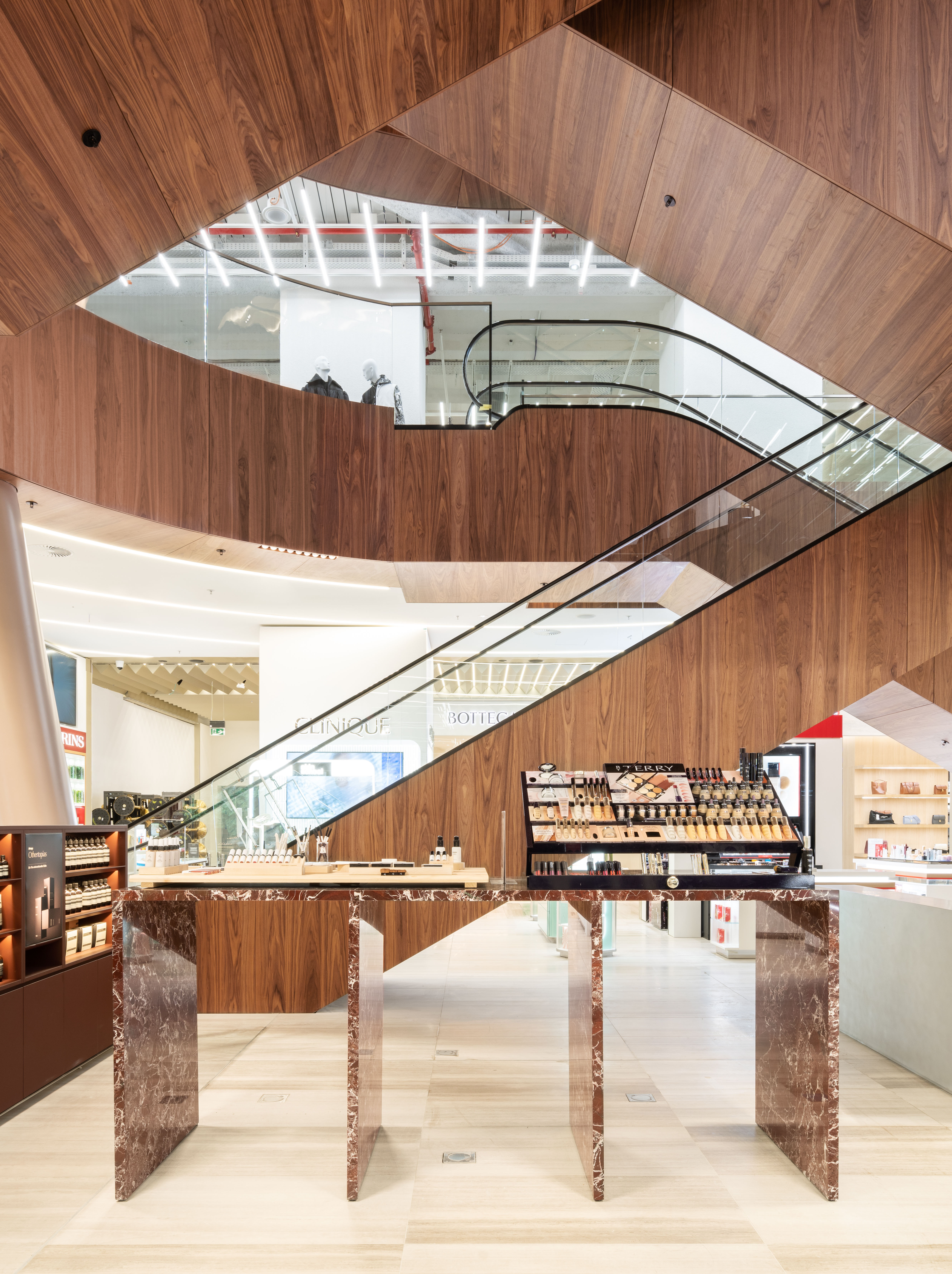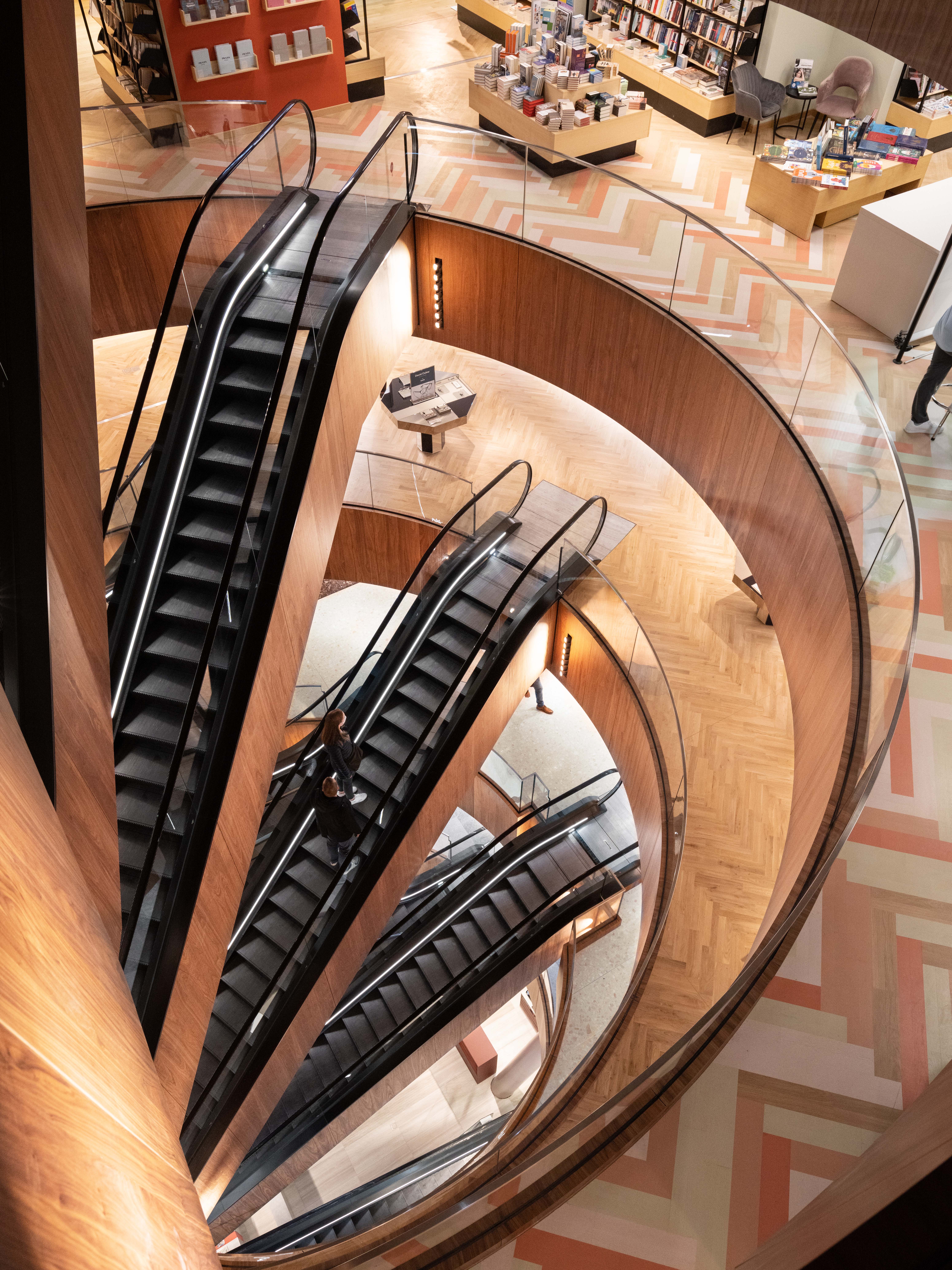 The historic Berlin department store Kaufhaus des Westens (KaDeWe) opened the doors to the first quadrant of the masterplan designed by OMA. A concentric void spanning six floors holds a series of wood-clad escalators. At the base, in extension of the Tauentzienstraße main entrance, the void serves both as a retail and event space. Outside, a two-story-high shop window for analogue and digital presentations has been introduced on the corner of the Tauentzienstraße and Passauer Straße.