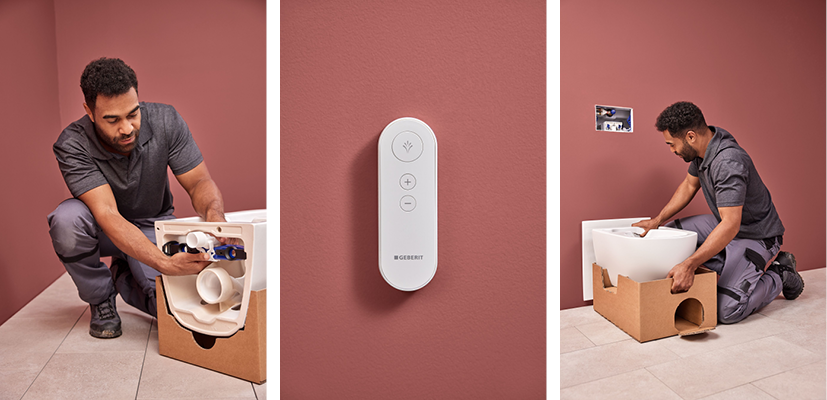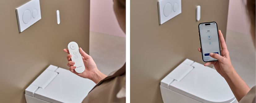 The Geberit AquaClean Alba has a slim, well-designed remote control that is both intuitive and comfortable to use. This makes it possible to start the spray functionality and regulate the spray intensity with just one hand. The remote control can be conveniently operated by hand or comfortably inserted into the wall bracket, where the magnetic, form-fitting design ensures it always returns effortlessly to its park position. Additional setting options are available through the Geberit Home app. If descaling is required, an otherwise invisible LED indicator on the front of the remote control lights up. This uses Geberit’s very own innovative light guide technology for a seamless blend of function and design.