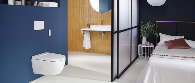 The Geberit AquaClean Alba has a slim, well-designed remote control that is both intuitive and comfortable to use. This makes it possible to start the spray functionality and regulate the spray intensity with just one hand. The remote control can be conveniently operated by hand or comfortably inserted into the wall bracket, where the magnetic, form-fitting design ensures it always returns effortlessly to its park position. Additional setting options are available through the Geberit Home app. If descaling is required, an otherwise invisible LED indicator on the front of the remote control lights up. This uses Geberit’s very own innovative light guide technology for a seamless blend of function and design.