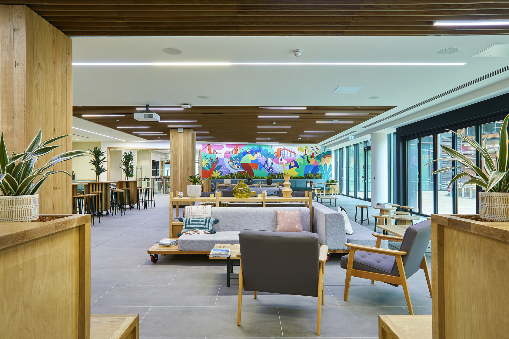 A central breakout space overlooking the ground-floor event area provides a social hub. Breakout/tea points in the centre of the office floors bring BBC’s Studios people together. A variety of furniture settings ensure that the space is activated for both work and socialising throughout the day.
