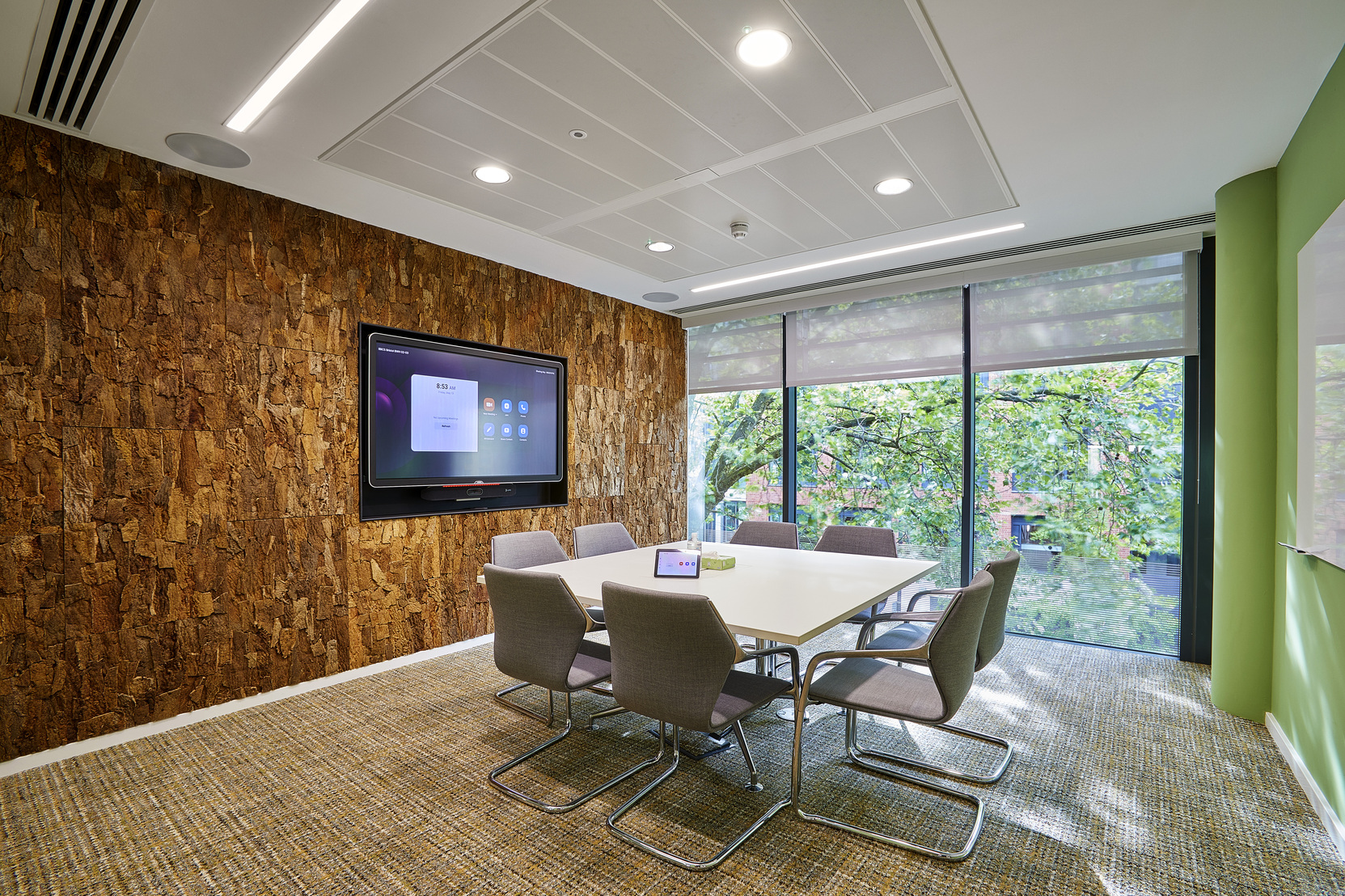 The material choices reinforce BBC Studio’s leadership in programming about the natural world. All timber used in the project was certified by the Forest Stewardship Council (FSC). The team sourced reclaimed wood in feature areas. Walls made of cork, a natural and rapidly renewable material that reduces noise, improves acoustics in meeting spaces.