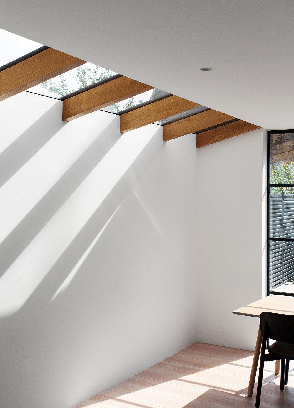 The building was modernised; adding underfloor heating, contemporary fittings and high-performance glazing whilst maintaining several original features. Natural light and space were concerns for the client and every opportunity was taken to increase the openness and brightness of the living spaces. HUT reconfigured the ground floor layout to create an open-plan social area to entertain. This culminated in the full width a kitchen/diner extension which connected the back of the house, to the front via an internal picture window; framing views beyond. Furthermore, the kitchen included the design of large steel framed doors that swing out into the garden, giving the homeowners direct access to outside. The amendments are playful and practically suited to contemporary living.