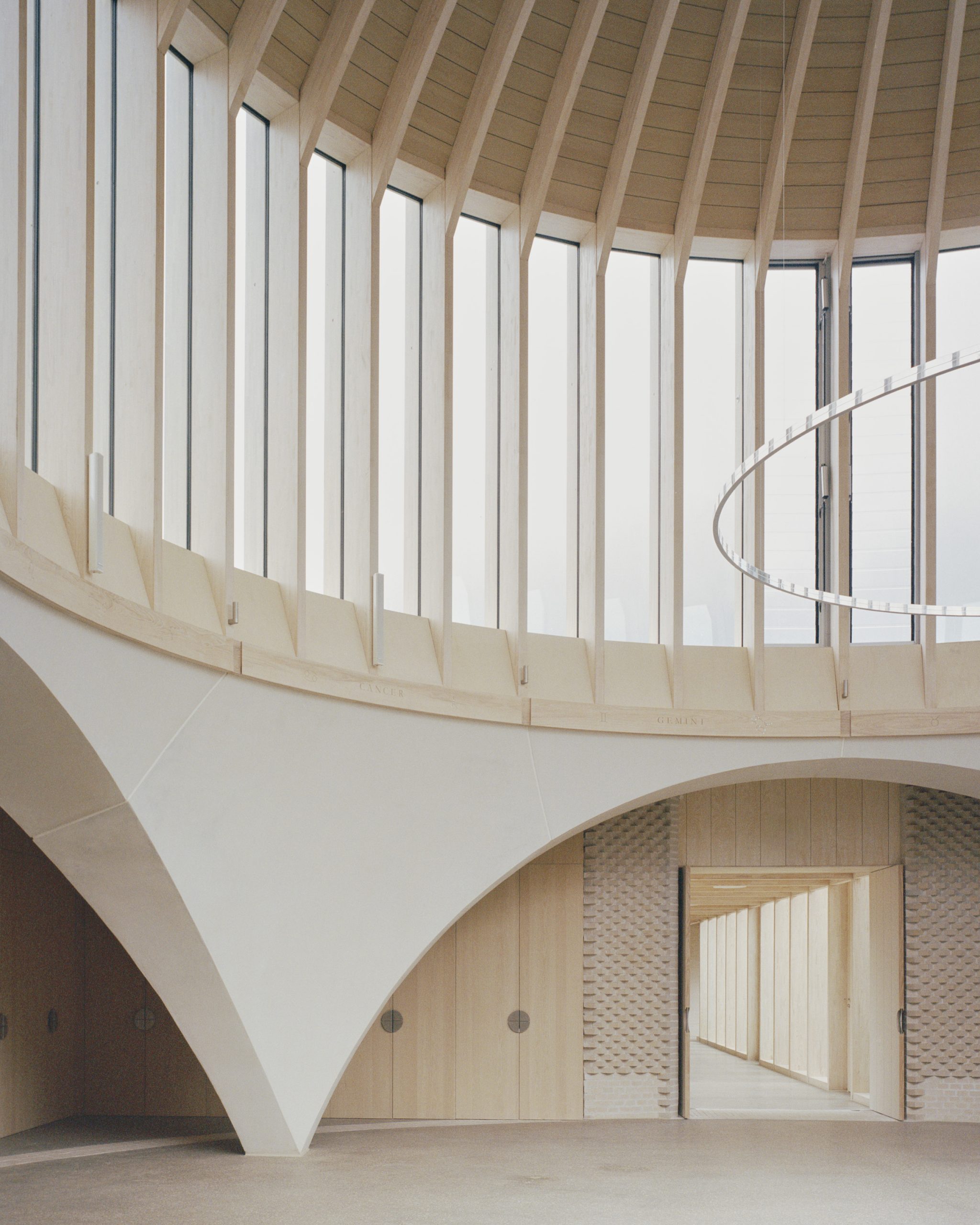 The building demonstrates an exemplar approach to passive design and long-term sustainability. JGA adopted a ‘fabric-first’ approach to the build, with the main structural frame entirely constructed off-site from glue laminated timber, engineered to eliminate the need for any steelwork. Underfloor heating is provided by a ground source heat pump that is buried in the landscape, with additional power provided by photovoltaic panels. The inner temple’s pre-cast pendentive arches provide thermal mass. A raised floor slab naturally cools the internal spaces with fresh air supplied by an underground labyrinth ventilation system, while high level actuators in the temple clerestory allow warm air to escape.