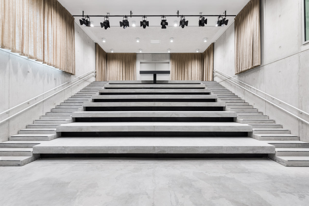 Apart from the ground floor auditorium, the Academy for Performing Arts is housed on the first two floors, flanking the reading atrium. Within the new building, the ballet room, rehearsal studios and teaching spaces have windows as tall and wide as the rooms themselves, providing a view onto the city and a glimpse inwards from the city, while giving expression to the façade composition. Using the same expressive language, the railings of the former Pupillenschool’s windows have been removed and the windowsills of the piano nobile have been significantly lowered.