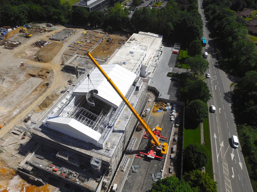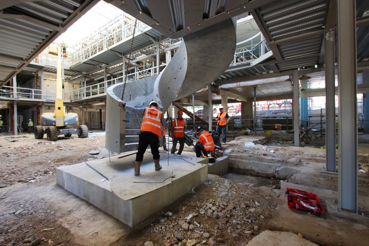 Kallisto were able to generate the required soffit using their specialist adjustable pallet moulding system, which also acted as the formwork for each storey height flight. Ducting and fittings for lighting were also incorporated into the concrete walls at this stage. The two 4m diameter flights, each weighing over 11 tonnes, were delivered to site on a low loader and installed in one day by one of Kallisto’s professional fixing teams, minimising disruption on site and providing an immediate access to the upper levels for other trades.