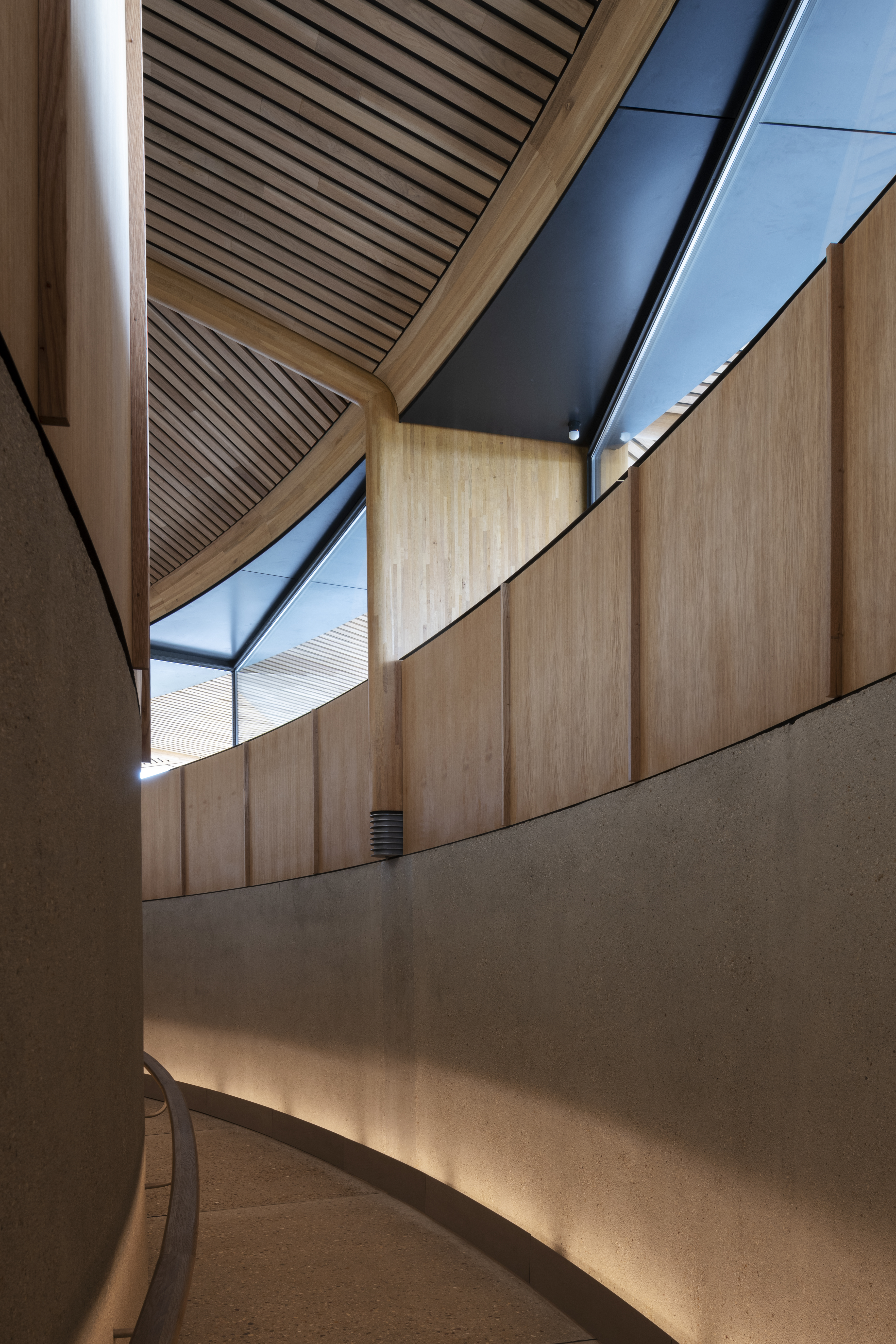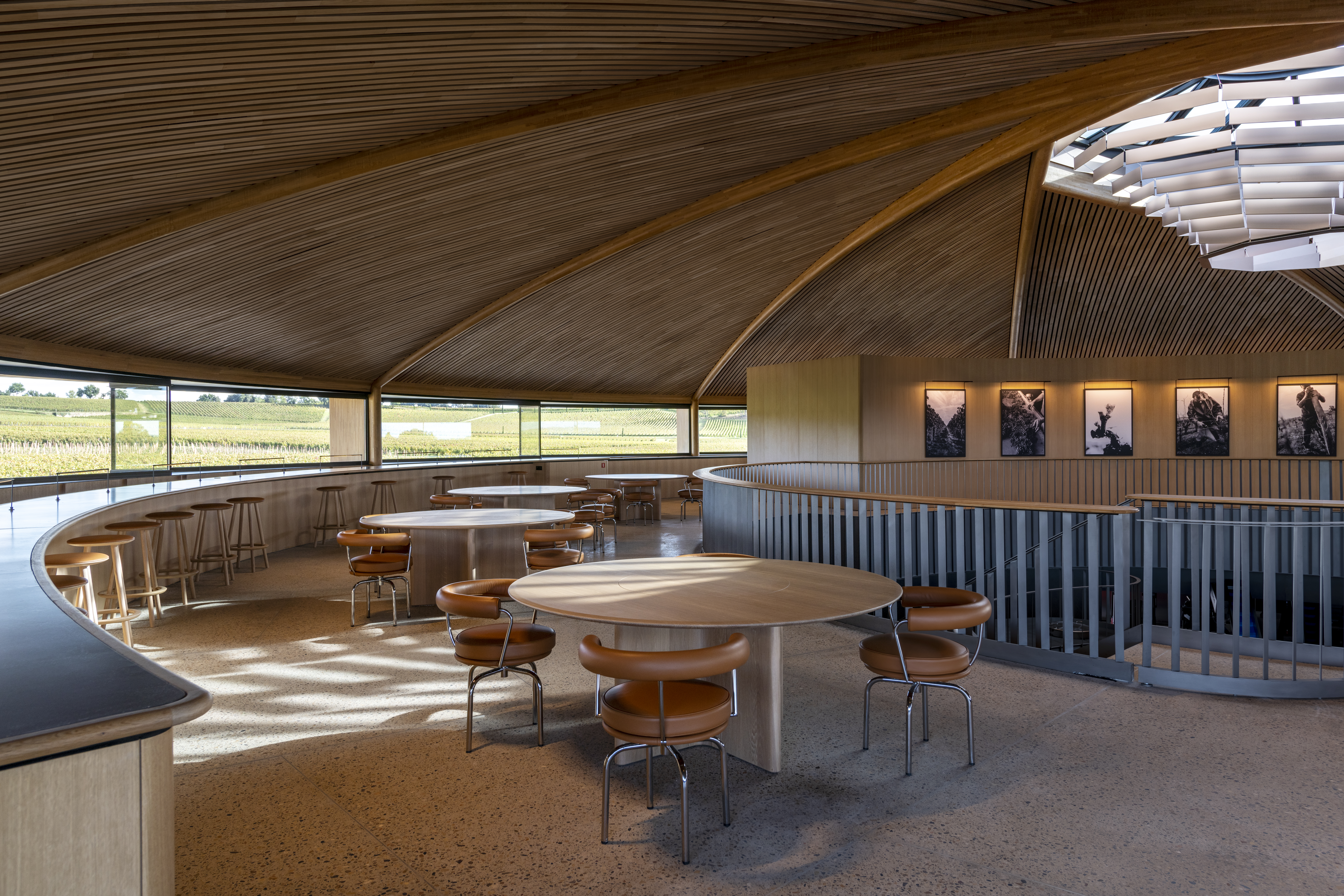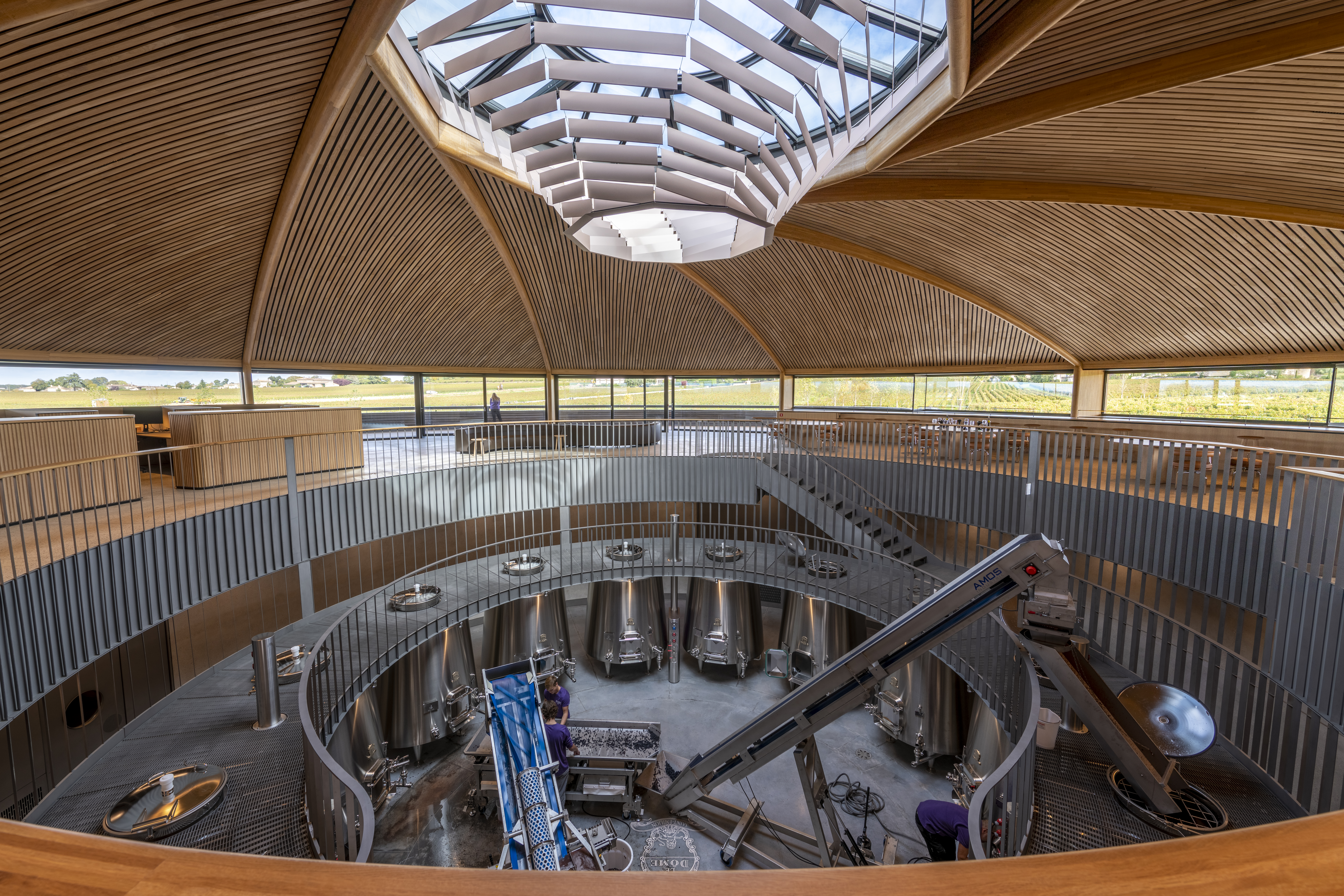 The architectural and industrial design teams at Foster + Partners worked closely from the outset to create an interior design solution that is an integral part of the architecture. A curved wine bar looking out onto the vineyards alongside circular tables forms the tasting area to the left. A circular atrium allows people to look down onto the wine production and storage spaces below, providing a holistic and unique experience for visitors. To the right of the entrance, discrete office pods help create space for focussed work within a busy environment. The timber screens wrap around the desk spaces to allow for acoustic and visual privacy while preserving sightlines to the outside and blending in with the architecture, with the lines in the ceiling reflected in the timber screens.