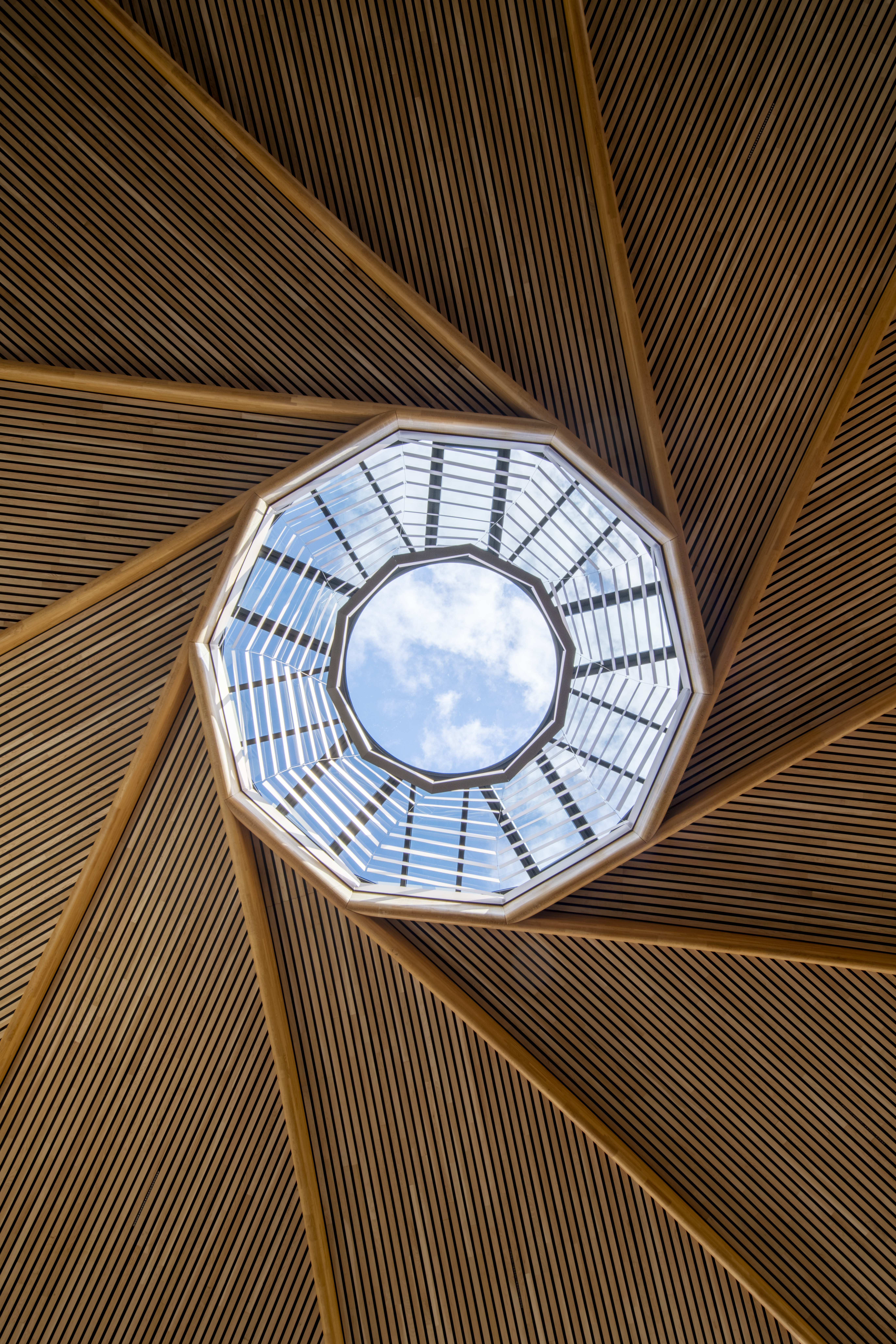 The 40-metre diameter timber roof is a unique reciprocal structure consisting of mutually supporting sloping beams that spans over large column-free space. The structure naturally creates a 6-metre-wide oculus at its centre, which allows daylight to flood the upper level. The roof is clad with recycled local terracotta tiles, while the base of the building – made with concrete using aggregate from the region – is covered with timber slats and partially buried into the ground to reduce its visual impact on the terrain and increase thermal mass performance. The building to reinforces the landscape by creating a hill-like form that echoes the gentle slopes that surround it.