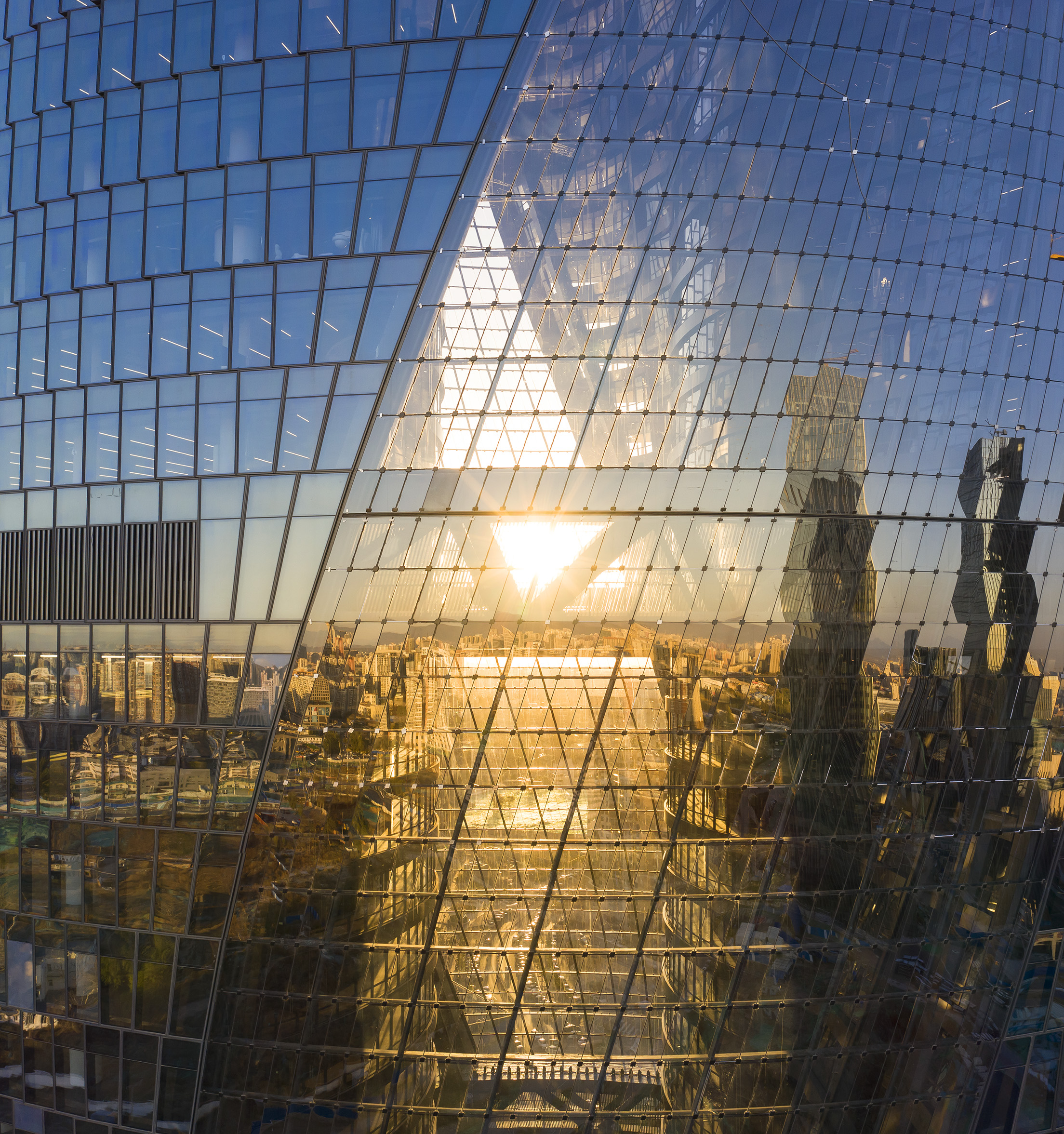 Leeza SOHO’s double-insulated, unitised glass curtain wall system steps the glazing units on each floor at an angle, providing narrow ventilating registers to draw outside air through operable cavities where required; creating extremely efficient environmental control for each floor.