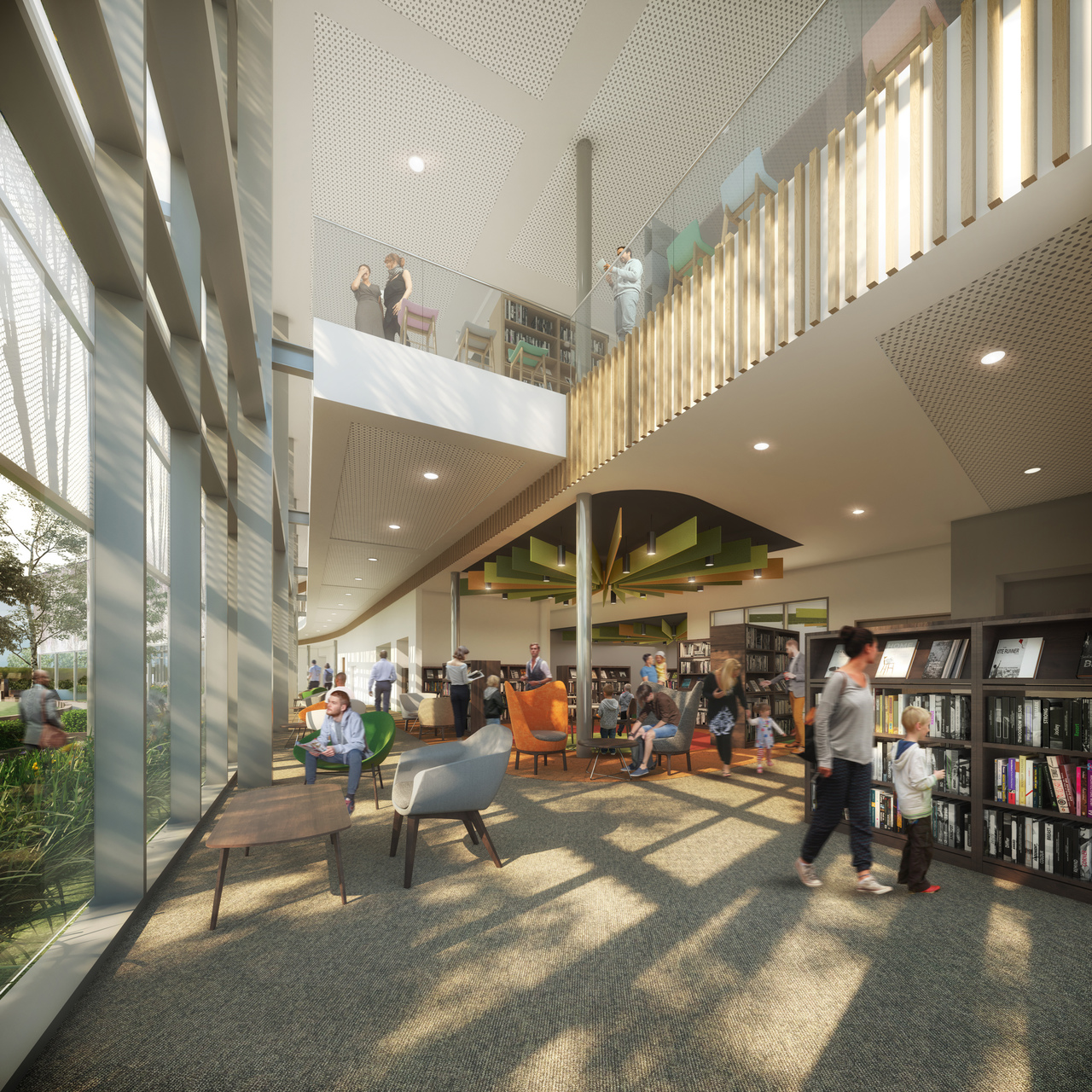 The centre will be located at Gas House Lane with a new library garden addressing the river from its north bank sat amongst the existing mature trees.