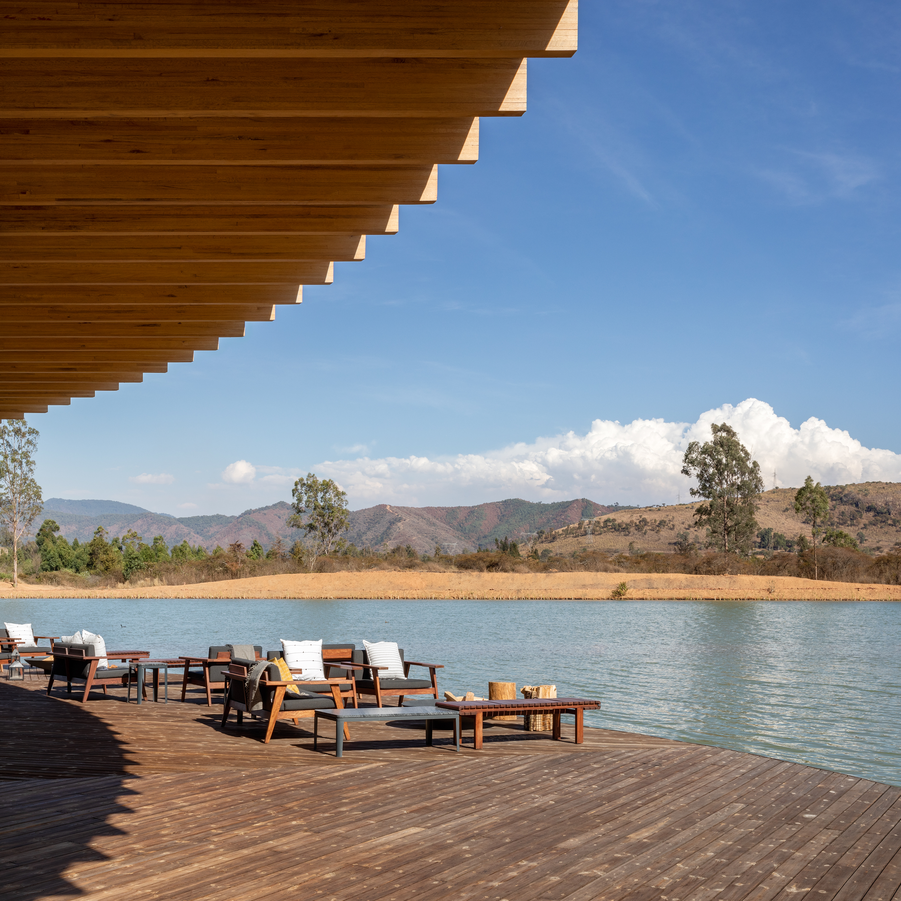 The 385-hectare development features a circular floor plan which is unique in design, drawing attention to the spectacular scenery, with the open layout allowing the sun to flood through the structure from dawn until dusk. The site consists of an 800-metre water-ski lake and the showpiece Clubhouse pavilion, as panoramic views of the lake are framed by rolling hills. Sordo Madaleno Arquitectos’ emphasis on open corridors and exposed rooms allows for 360-degree views of the surrounding topography, including forests and mountain vistas, from almost every position of the Clubhouse’s interior.