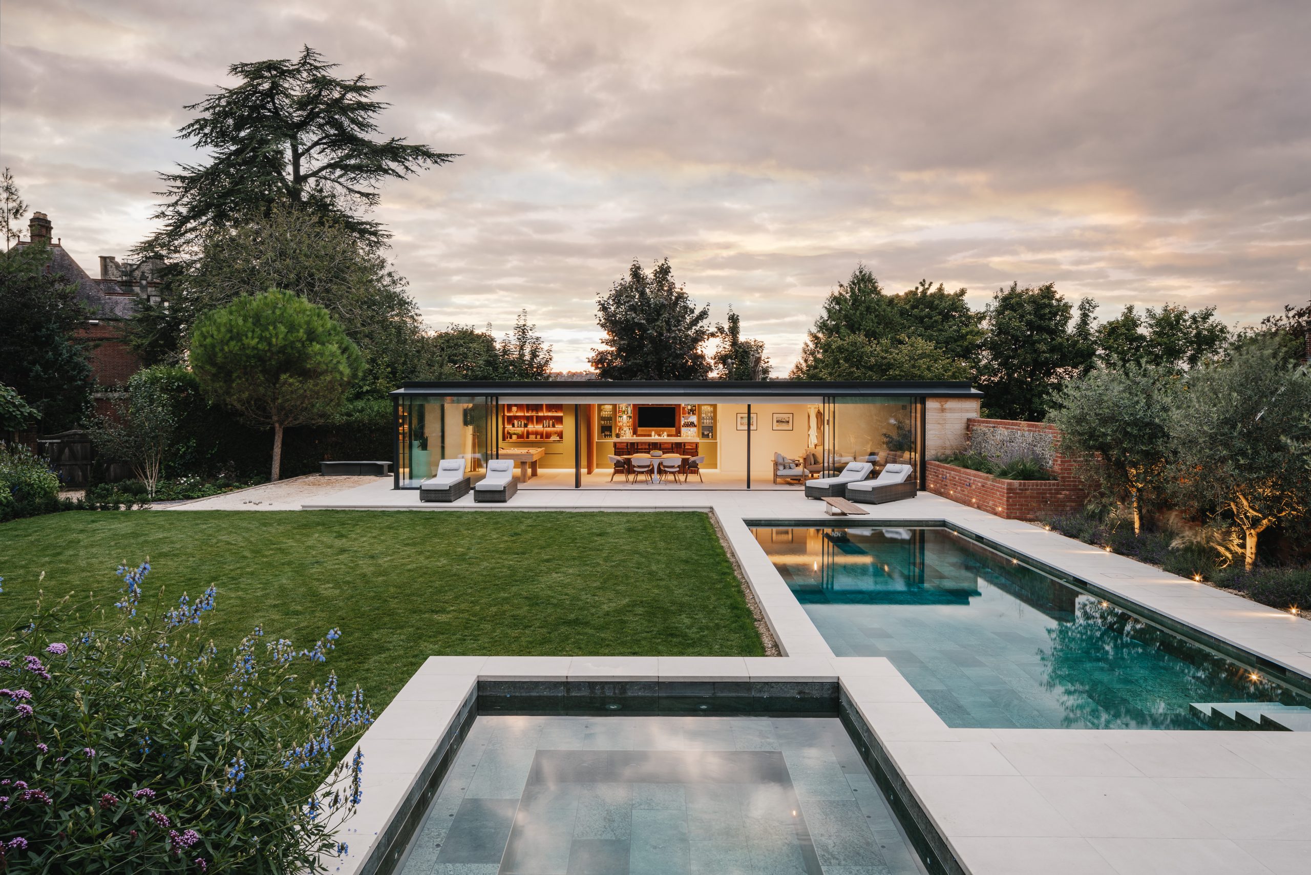 At our Spa House project, we wanted to create a sleek yet impactful structure that draws the eye to the end of the garden and provides an interesting visual contrast to the main period property. The pavilion utilises extensive photovoltaic panels across the flat roof to provide sustainable electricity to help run the spa and pool year-round.  It was crucial to the success of the project to carefully plan the pool layout and the border planting, to ensure a sense of connection between the two buildings and that the garden house becomes a true extension of the home’s existing living and entertaining spaces.’