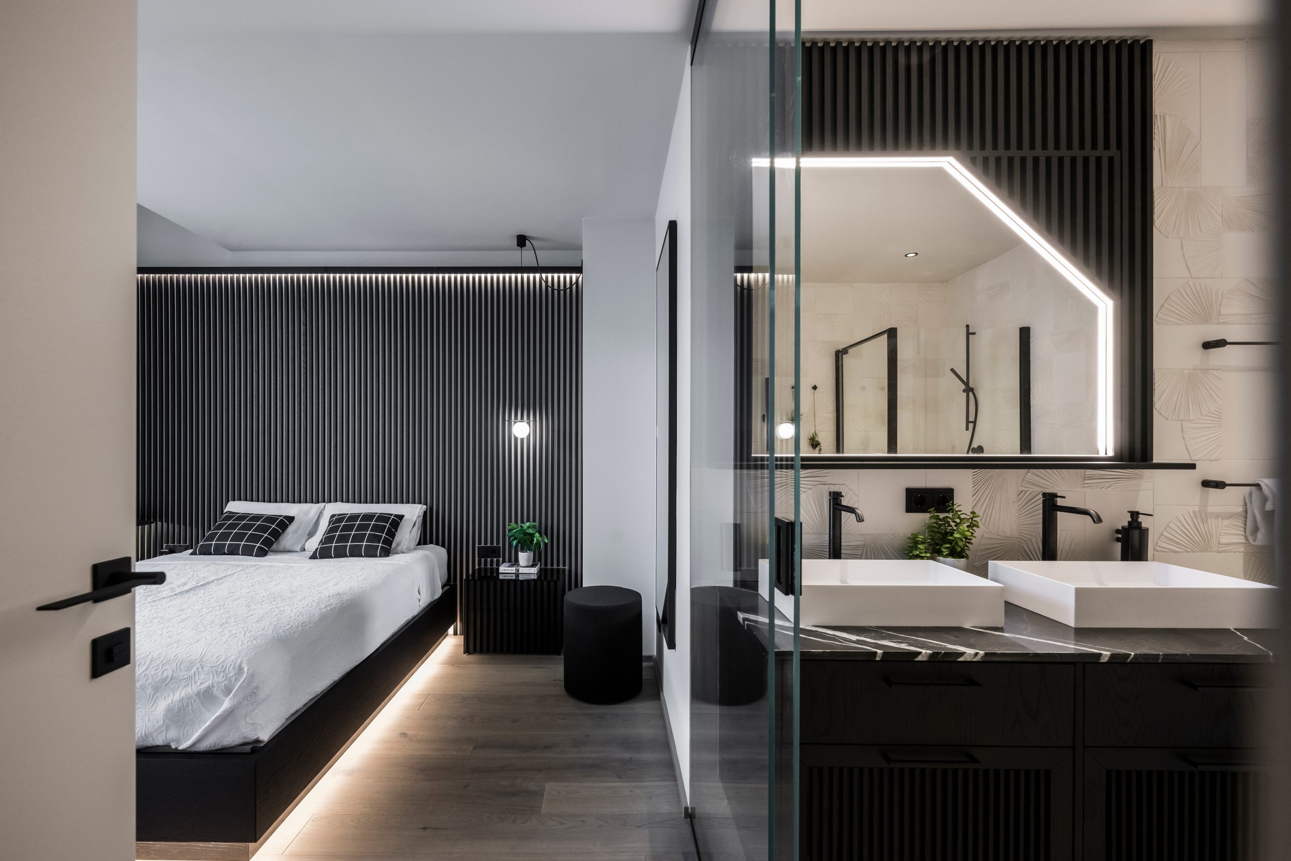 The furniture pieces include the Tufty-Time sofa by B&B Italia, the black leather chairs from the Era Chair collection by Living Divani, the saffron nubuck leather chairs from the Gemma collection by Baxter, the Paper Pendant rice paper lamps by vipp and the Hat lamps by Aromas del Campo. The surfaces are in contrast: black ‘Noirblanc’ quartzite by Antolini was used for the kitchen top, the bar cabinet and the coffee table, while for the dining table, the designers chose white ‘Montblanc’ quartzite by Favorita. White also returns in the bathrooms’ surfaces, where tiles from Botteganove’s Flora collection reproduce large Polynesian palm leaves as in a macro photograph.