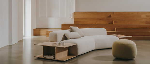 PLUS | new curved modules is also presented paired with a new low table featuring an architectural design and versatile vocation: placed next to the sofa along its longest side – measuring the same as the seat and back combined – it elegantly closes the corner providing a handy top. When turned around – so that the short side measures the same as the seating surface – it complements the composition more freely, also acting as a dividing element between two modules. Open wide on all sides, it is perfect for housing your favourite objects or books.