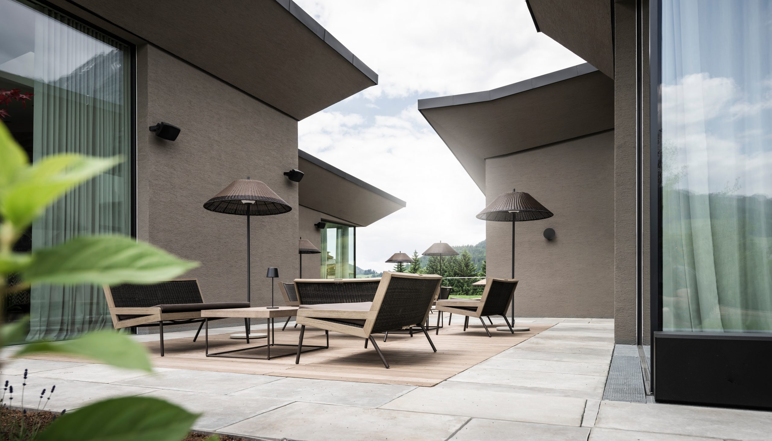 Adjacent to the restaurant, a sun terrace oriented in different directions offers a view of the mountain panorama and the meadows. The space is characterised by the tilted section of the projecting roofs, whose architectural silhouette changes constantly depending on the viewing angle. A very exciting open space is created between two closed structures, which strongly influences the perception of the landscape. Separated from the restaurant by the sun terrace are two other relaxation rooms, one with natural stone dedicated to the earth and the other with sisal surfaces open to the air. From here you can get return to the basement and the main pool. This completes the cycle of the wellness area at the point where the building merges back into the landscape.