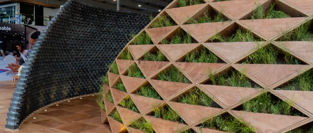 A wall built from bricks made by Scottish company Kenoteq using recycled construction waste has formed the centrepiece of one of the major showcase spaces at the 28th meeting of the United Nations Climate Change Conference (COP28).