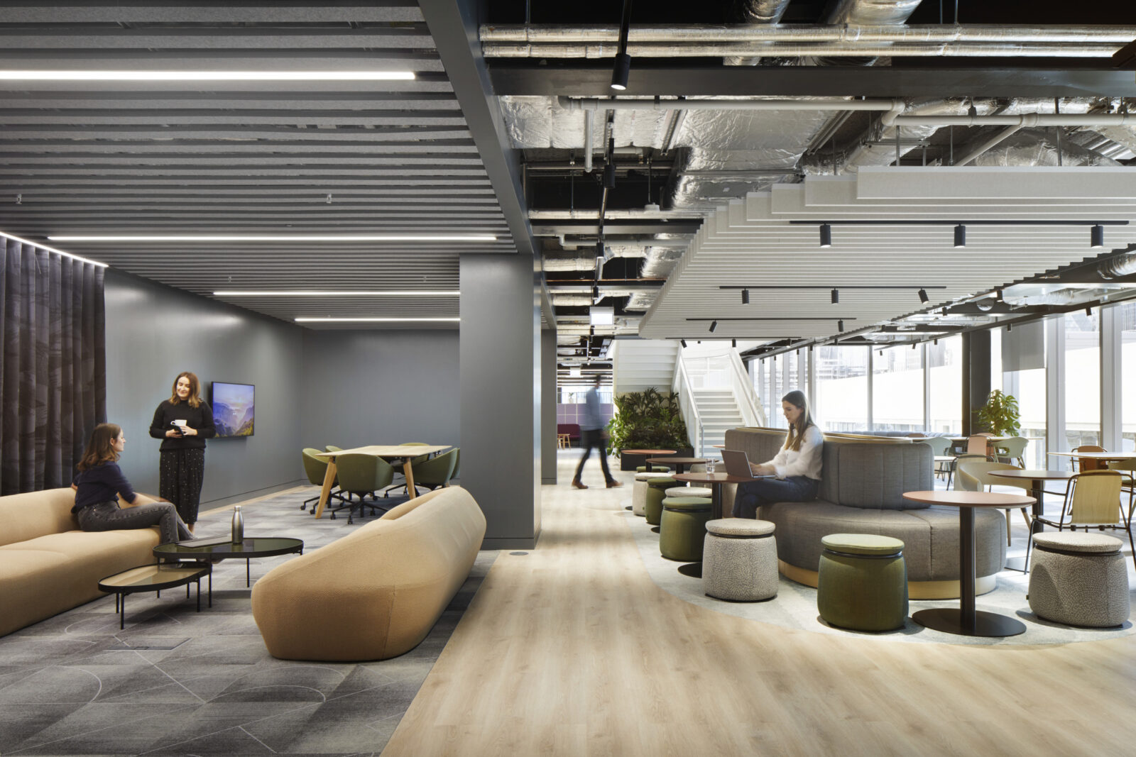 Physical and visual connections are key to the design of the London HQ. We added a new staircase to the base-build to connect levels five up to 15, encouraging physical movement between floors and the different spaces the contain. In the double-height reception, which is animated by café and retail spaces, visual connections with the customer-focused “showcase” floor on level 1 are made.
