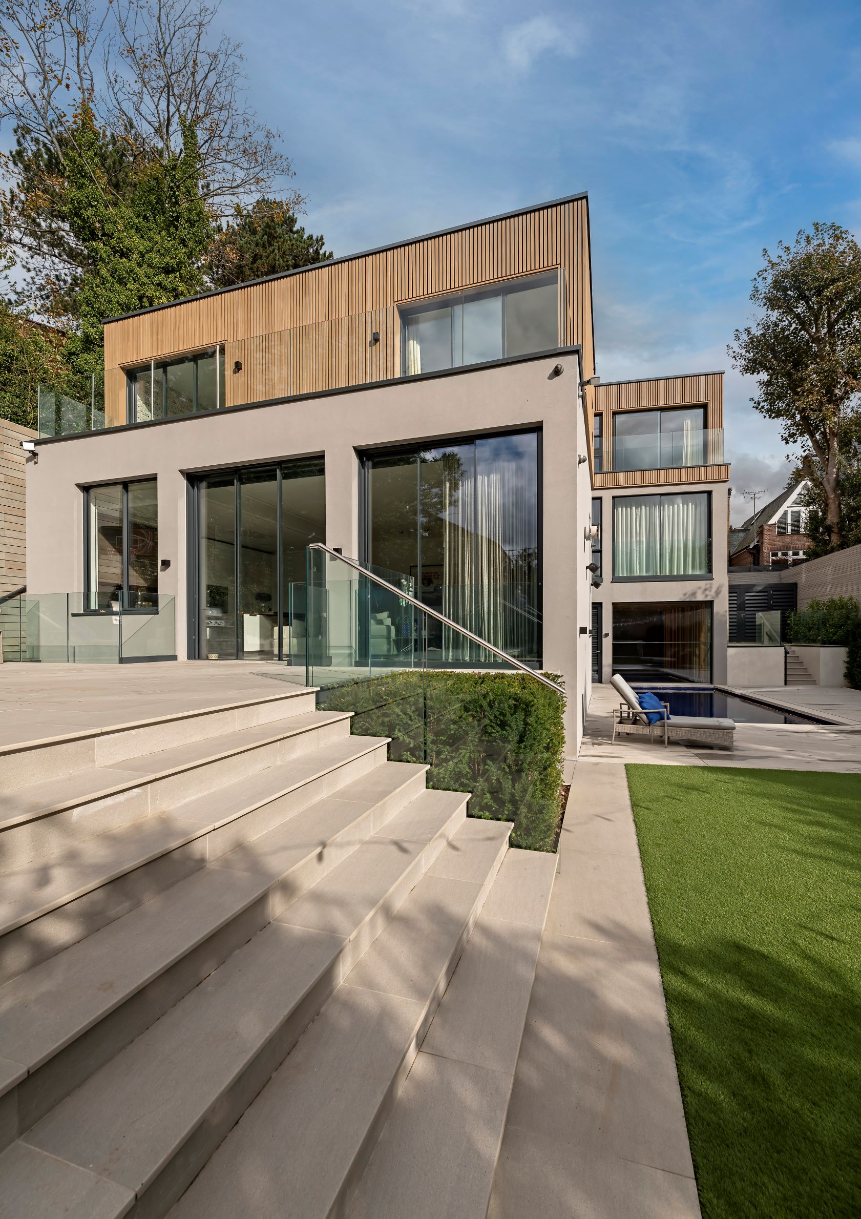 The use of natural shade renders, low maintenance and enhanced longevity mock timber cladding and extensive fenestration kept the overall aesthetic simple and versatile. A fairly minimalist and crisp material palette was adopted to contrast the natural setting including warm hardwood flooring, white walls for the core, ground and lower ground floors as well as timber finish slats. Green roofs were also introduced on each wing to enhance natural habitat creation as well as helping the building blend in the large garden, particularly from neighbouring higher vantage points.