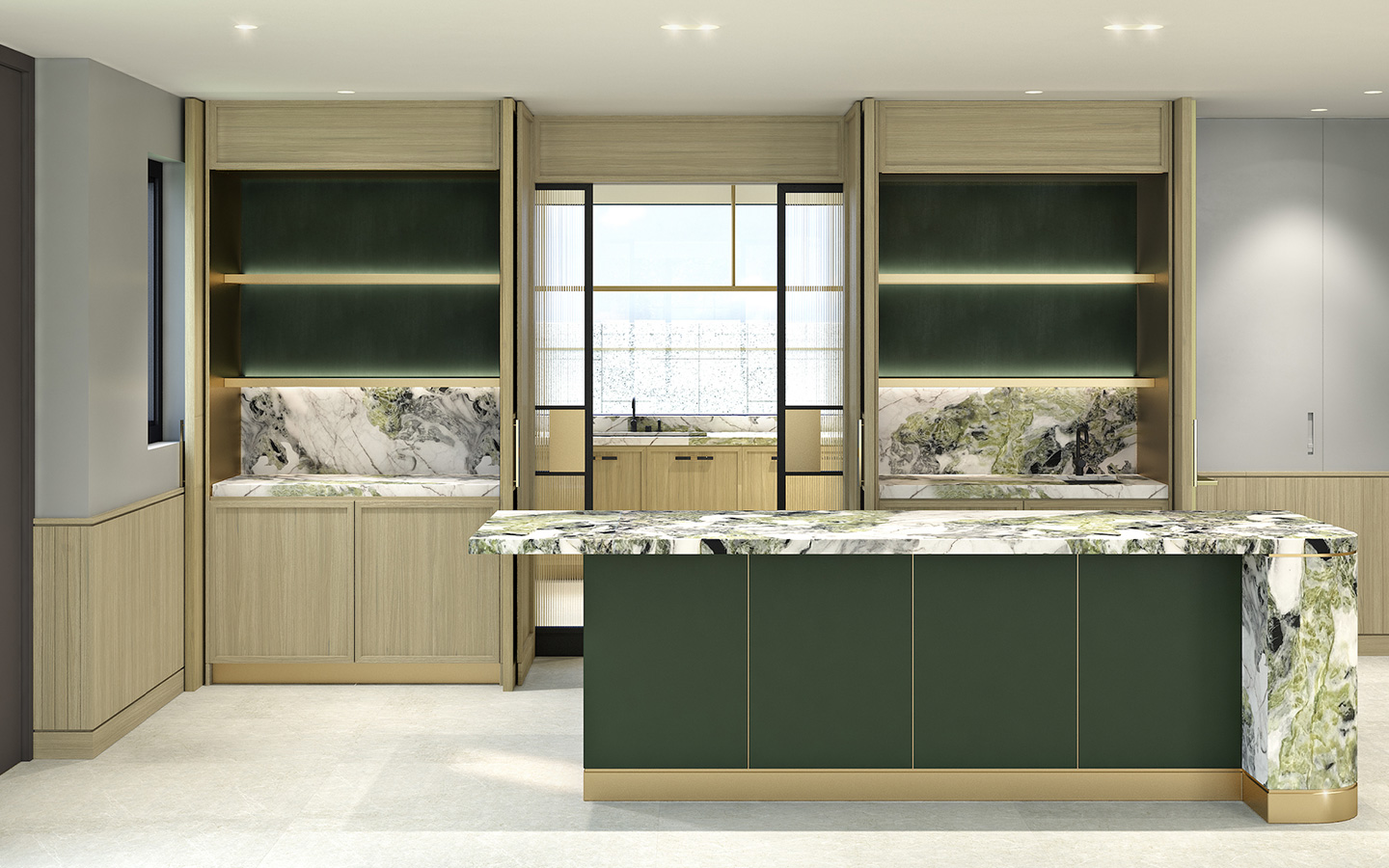 The design team embraced British culture and influences in all aspects of the interiors. As such, the palette of materials is distinctly British with oiled Oak finished timber flooring in custom patterns, brushed brass features to joinery, natural stone kitchen worktops.
