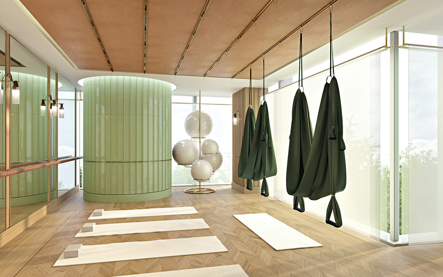 The design further set out to create relationships with the outdoor spaces of the development and the architecture. The greens used internally reflect the lush surrounding landscaping, as does the extensive use of timber. External building facades are partially clad in metal panels in the shape of rhomboids. These geometries have been applied SHH to interior stone floor patterns, and walls that are clad in stone with brass inlays.