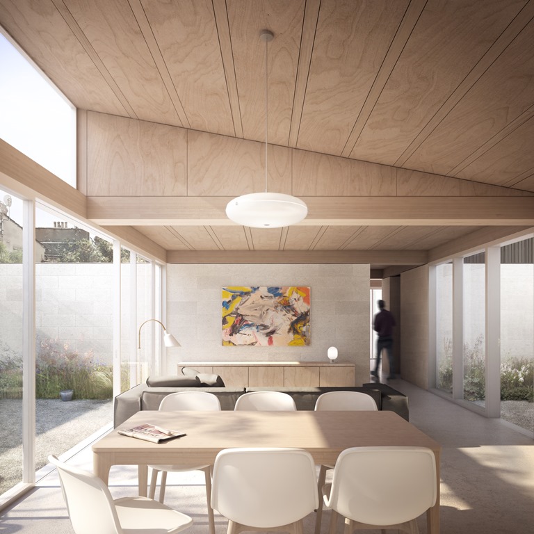 Situated on a backland site in Walthamstow surrounded by Victorian terraces, the form is designed to capture maximum direct sunlight through gaps in the surrounding Victorian terraces. Shallow pitched roofs allow clerestory windows which add light, sky views and spatial interest to an otherwise landlocked site.