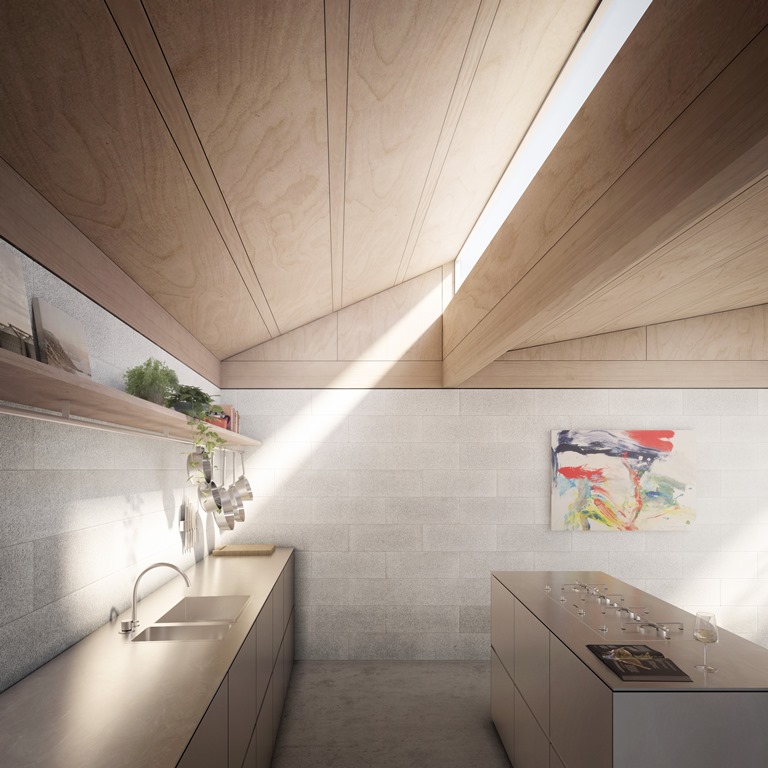 The house is constructed of a double skin of fair faced Lignacite blockwork with colour matched mortar. The blockwork will be left exposed both internally and externally, a simple and robust palette that excludes any paint or plasterboard. The fairfaced block is complemented with a polished concrete floor, timber panelling, simple stainless steel kitchen and natural anodised windows and doors.