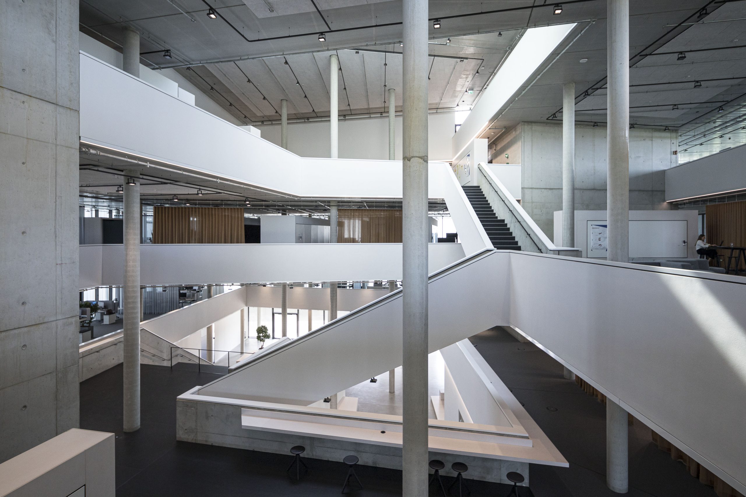 The new Headquarters is a platform for connection and collaborative work. The 13,250 square-meter building contains a public canteen, flexible collaboration spaces, dedicated work areas, a gym, and rooftop terrace with views of the Alps. The spaces are organized around a dynamic interior atrium whose rotating and overlapping cut-outs create a mix of single, double, and full-height spaces. The atrium creates an energetic social core for the building, and its cascading staircase functions as an informal communication space.