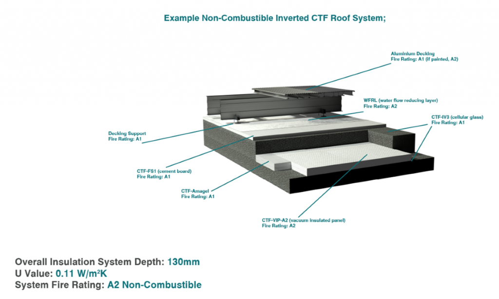 As a flat roof insulation specialist, we are constantly sourcing and developing optimal product solutions to meet and exceed client’s requirements and expectations. Our latest product solution is our CTF-Ultra VIP- A2 systems; an insulation system range combining various non-combustible individual CTF products to provide a complete non-combustible insulation system to meet any required specification and U Value for inverted and warm roof application.
