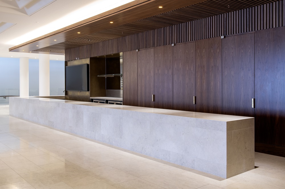 Working to the designs of Stanton Williams Architects, Szerelmey installed extensive new stone flooring, stairs, terrace and ramps and a new bar area. The grand new feature staircase is clad in large blocks of Crema Marfil stone with integrated lighting and curved glass panels. This has opened up a connection between the main foyer to the Paul Hamlyn Hall and the escalator to the Amphitheatre level. Two new bar fronts in Crema Marfil were installed in the Level 4 Amphitheatre restaurant and the existing stonework on the Winter Garden, outside the Amphitheatre restaurant, cleaned by the Szerelmey Restoration team. Part of the project involved creating a new entrance foyer on Bow Street to increase public access, and to enable this, Szerelmey laid Royal White and Kobra granite paving to form a new terrace area above the entrance and two remodelled sloping staircases in addition to relaying the old pavement to new gradients.