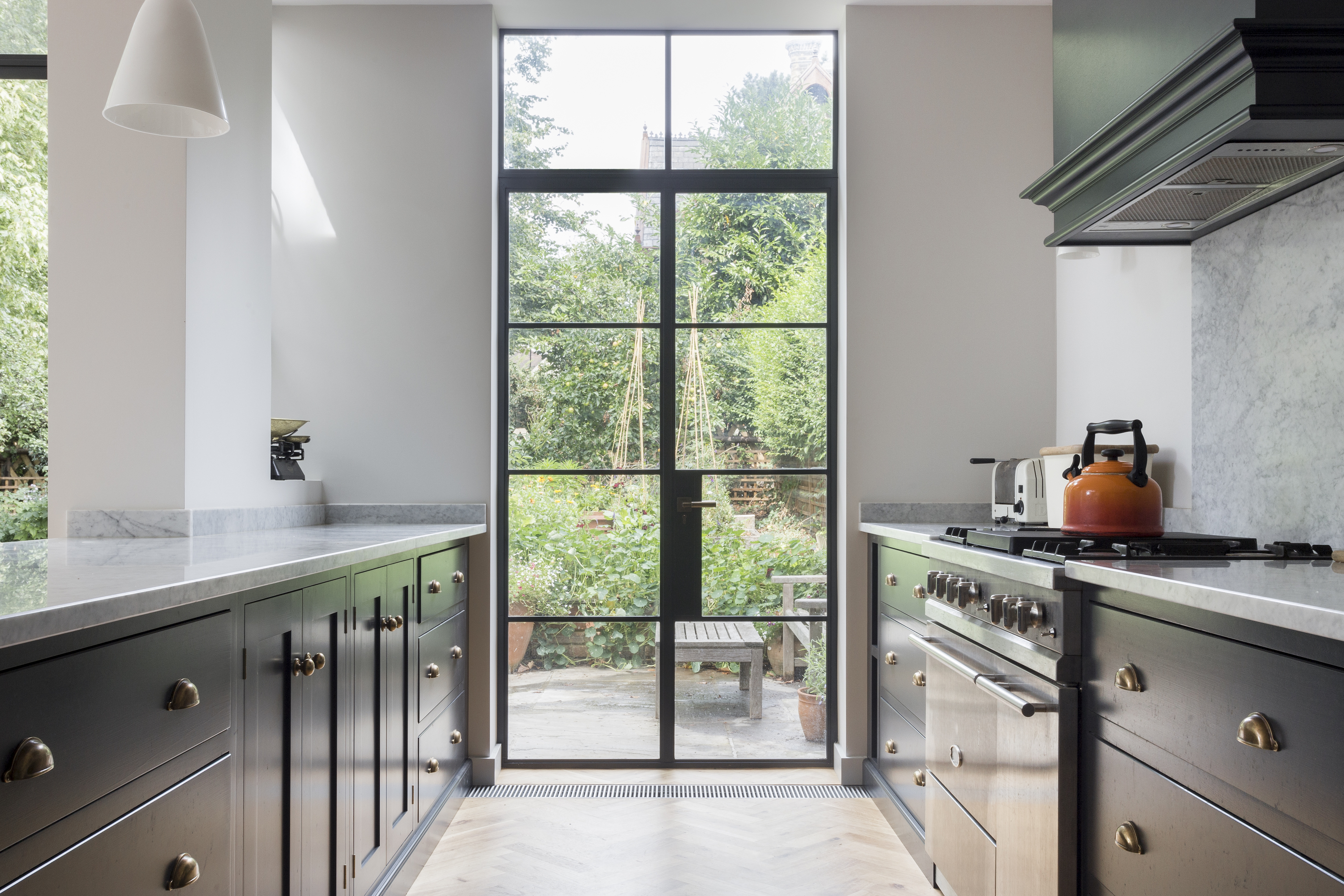 In the kitchen, materiality was key to creating a timeless look. Working with DeVOL, the studio created a bespoke Shaker style kitchen in a deep inky blue hue with Carrara marble work surfaces. A mix of cabinetry with open-shelving, large stainless-steel appliances, brass detailing, bone china lighting and a Belfast sink; all work harmoniously in a modern, classic style. Adding a richness to the space, mid-century oak furniture complements herringbone wooden flooring used across the ground floor.