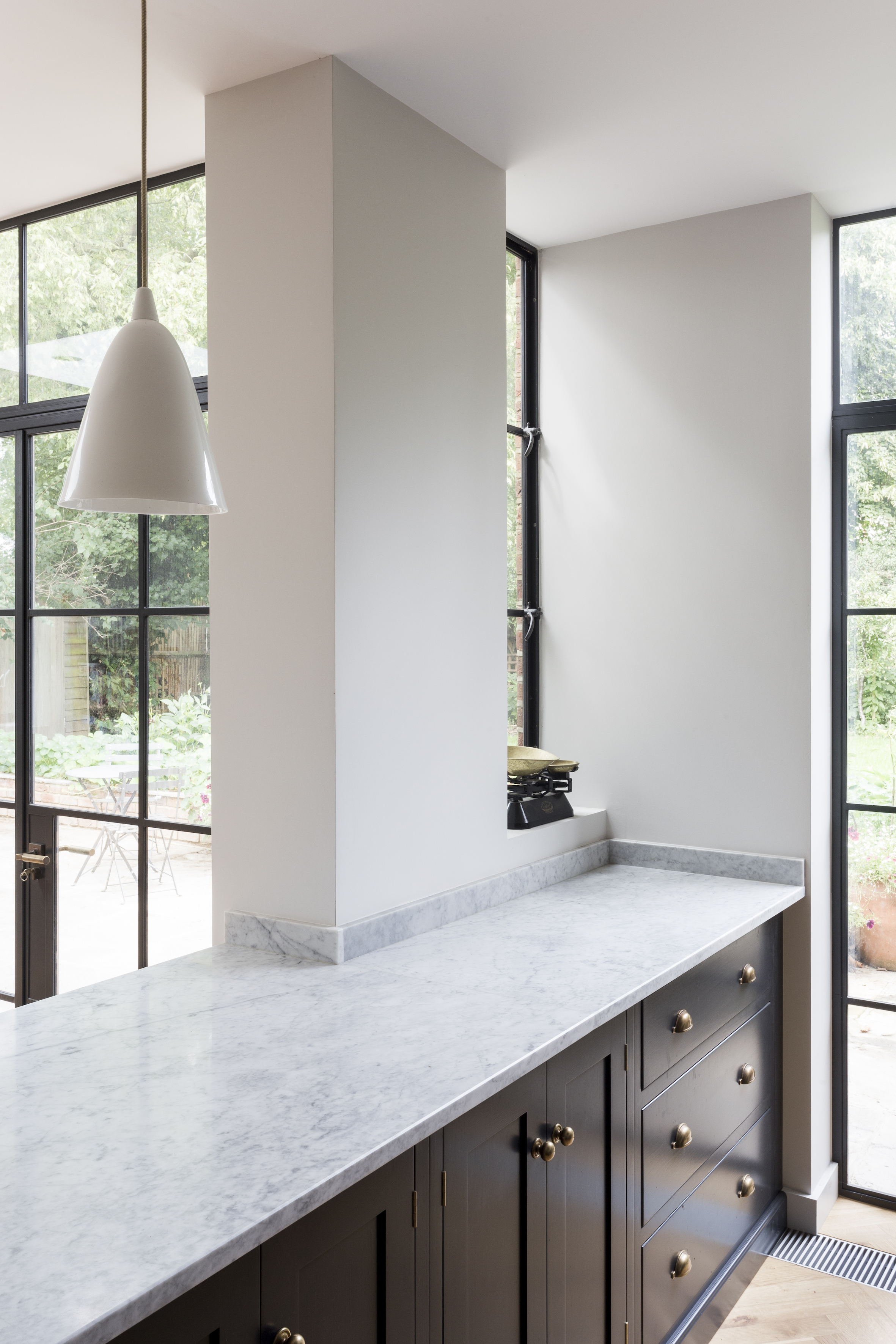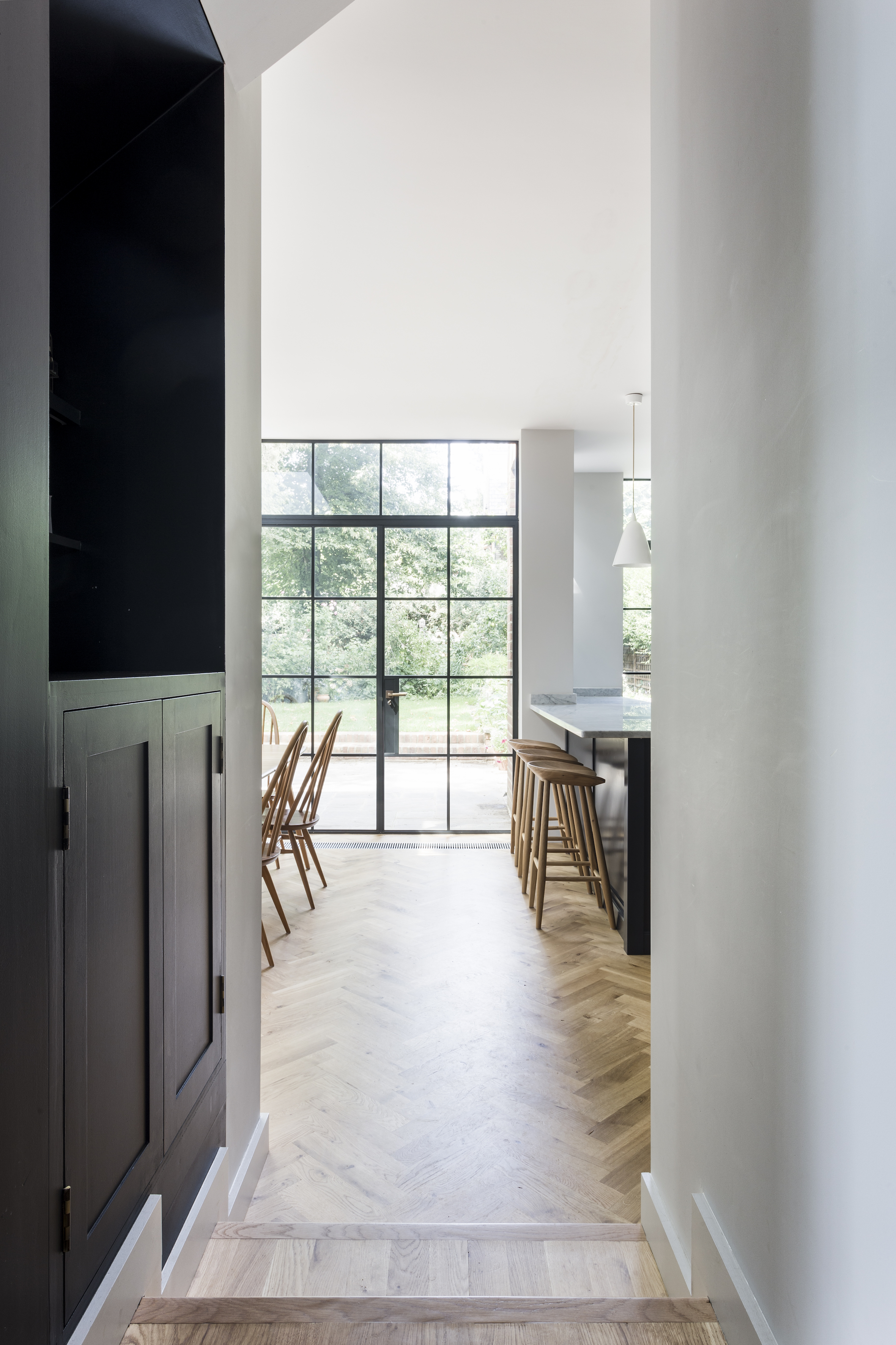 With the clients being keen gardeners, the studio wanted to ensure the south-facing garden was integrated with the elegant new extension, bringing a feeling of the outdoors inside. Adding a natural slate patio, the studio created a simple but effective transition. Maximising natural light through architecture is fundamental to the studio’s work. Utilising the large metal framed glazing and a sky light, natural light from the garden is pulled through the interior creating a bright and airy living space. With carefully considered design, TR Studio completely changed the character of the rear of the property with a subtle modernity.