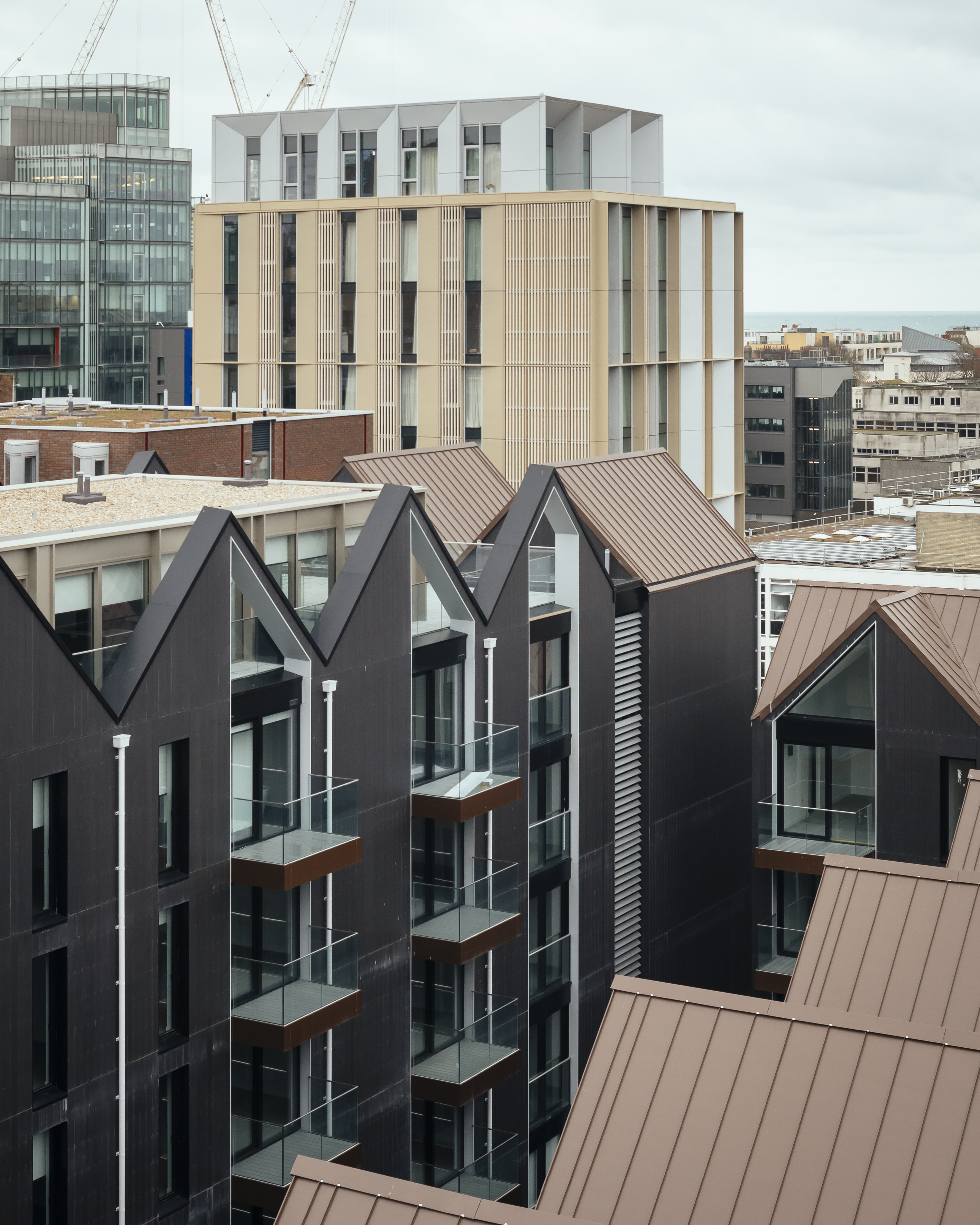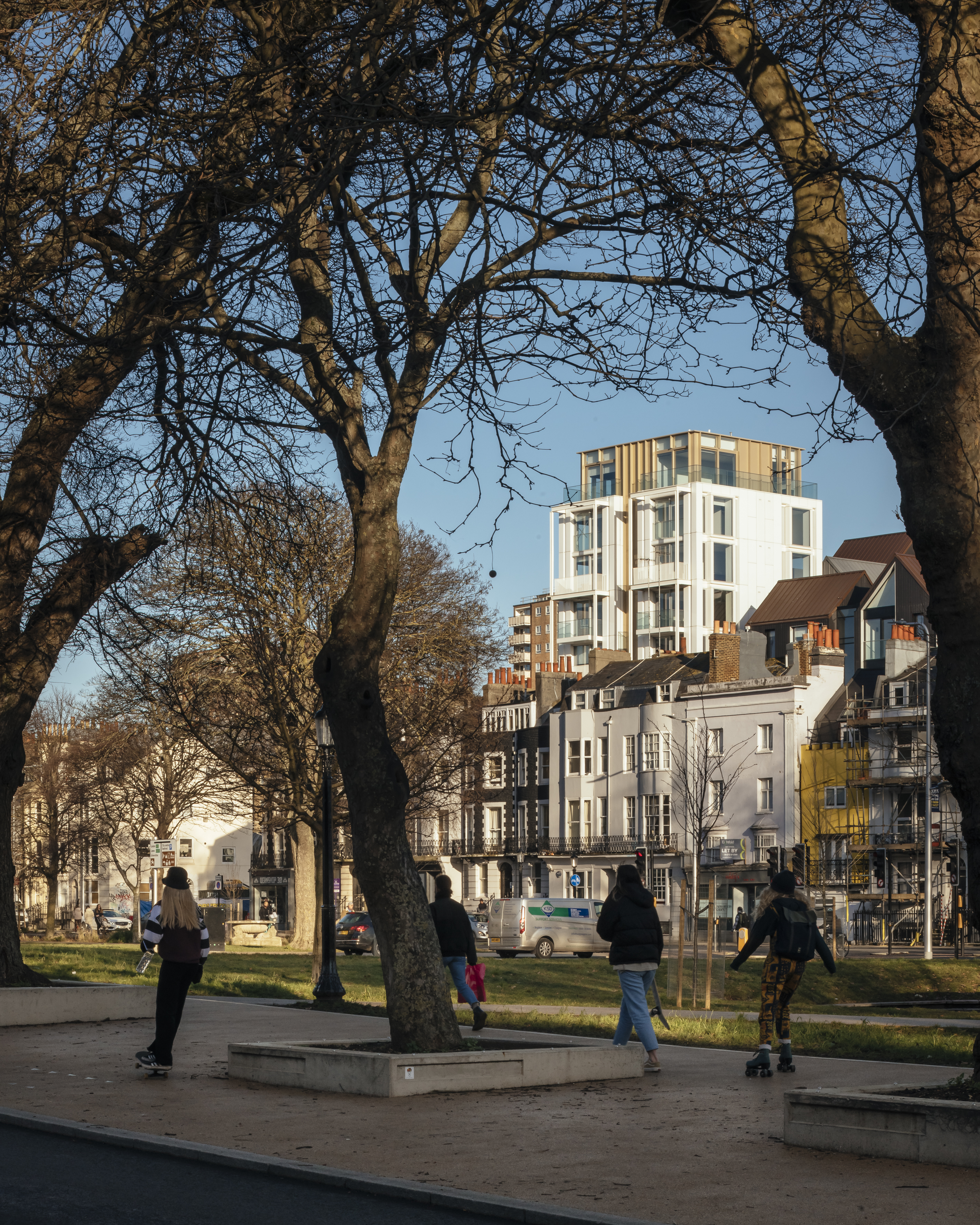 Massing is broken down into tall, slender ‘townhouse apartments’, scaled to the proportions of those on the listed Grand Parade terrace. Each townhouse is further articulated as twin bays with balconies, strong gable forms and pitched roofs. The buildings facing Circus Street create a strong ridge line and simple backdrop to Grand Parade, with zinc roofs that can be read alongside the tiled roofs of the listed terrace, while the cluster of pitched roofs recreates the historic view of the hillside. Each core serves no more than four apartments and breaks up each terrace, adding individuality to each block.