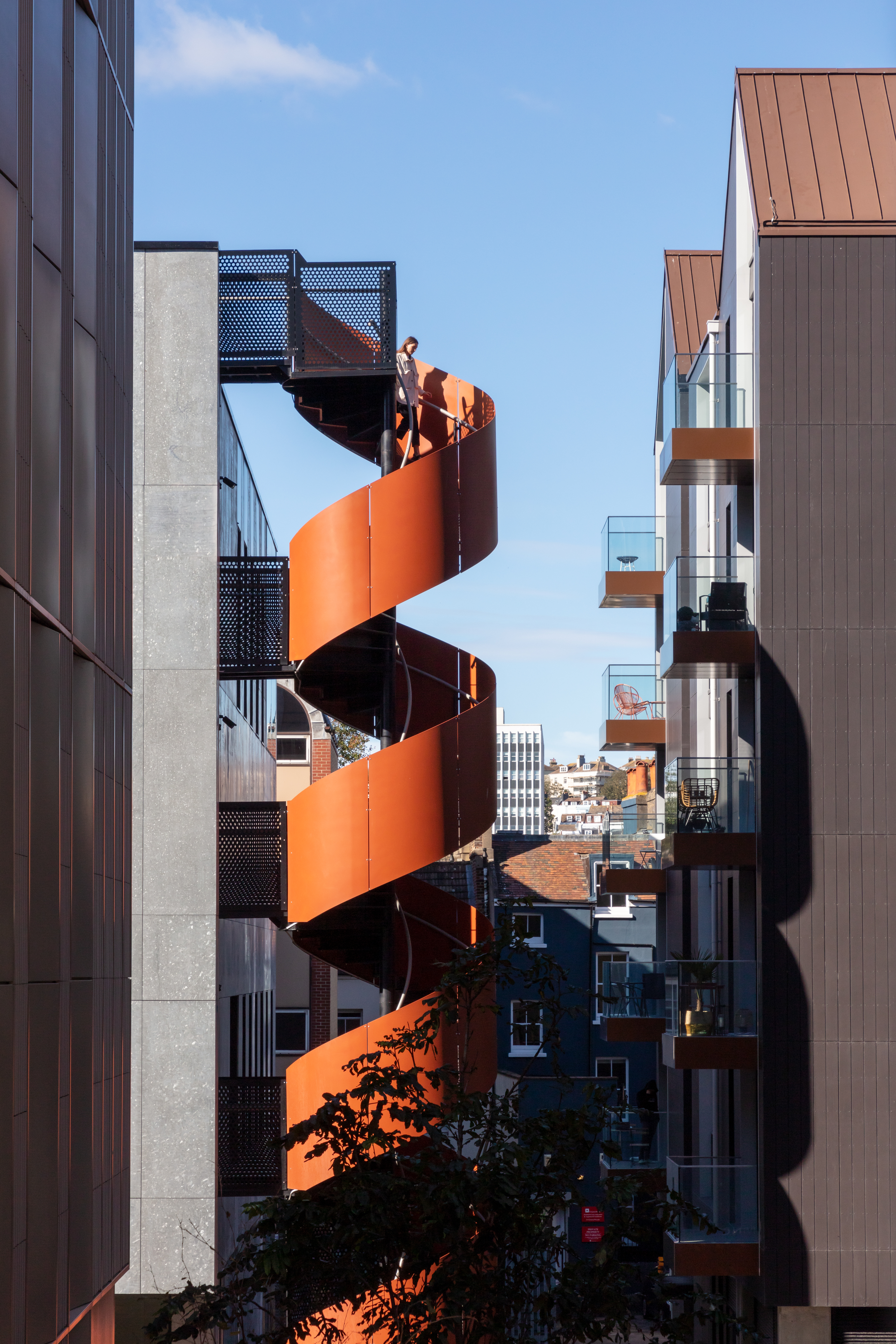 The scheme offers 114 one- and two-bedroom apartments for private rent – operated by M&G Real Estate – and 28 affordable homes arranged across four residential buildings. shedkm has created an apartment typology inspired by Brighton’s most loved streets, from grand Regency townhouses to the smaller terraces that line the hillsides.