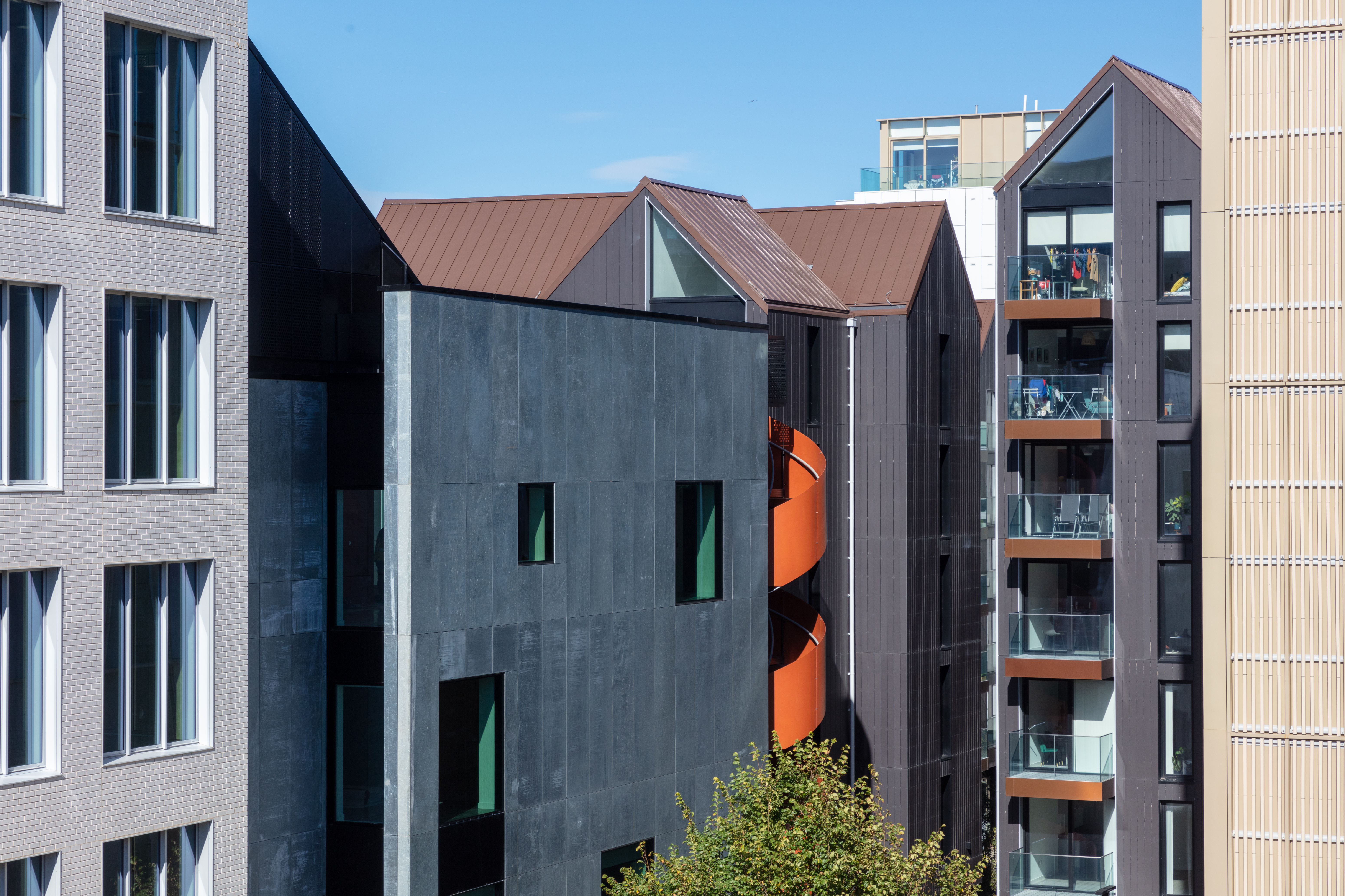 Sustainable principles informed the design and construction of the whole neighbourhood, which is formed around three new planted courtyards. All of the buildings are rated BREEAM Excellent and have been designed to be highly energy efficient with photovoltaic panels providing green energy to all new homes and green roof systems to encourage biodiversity.