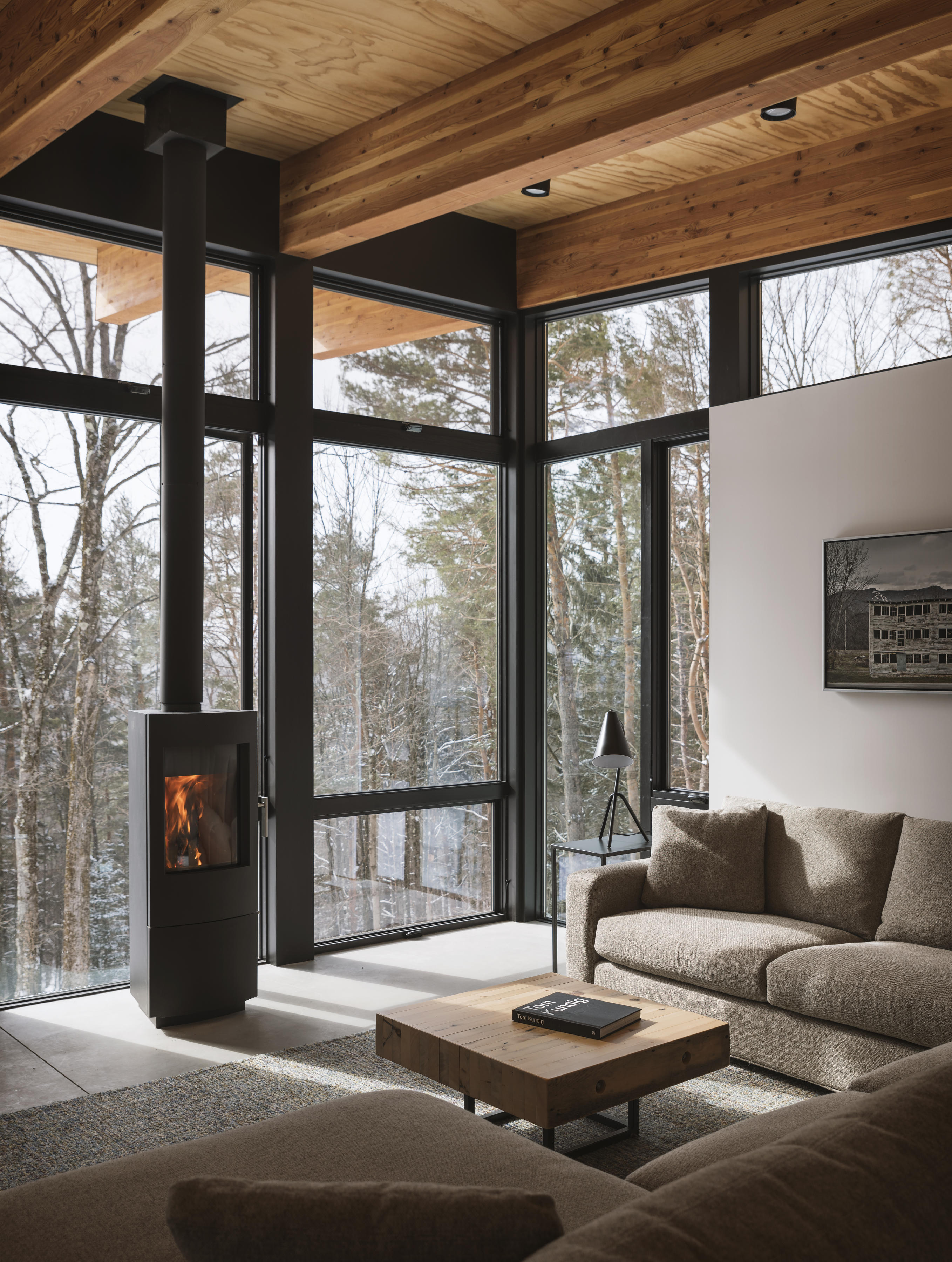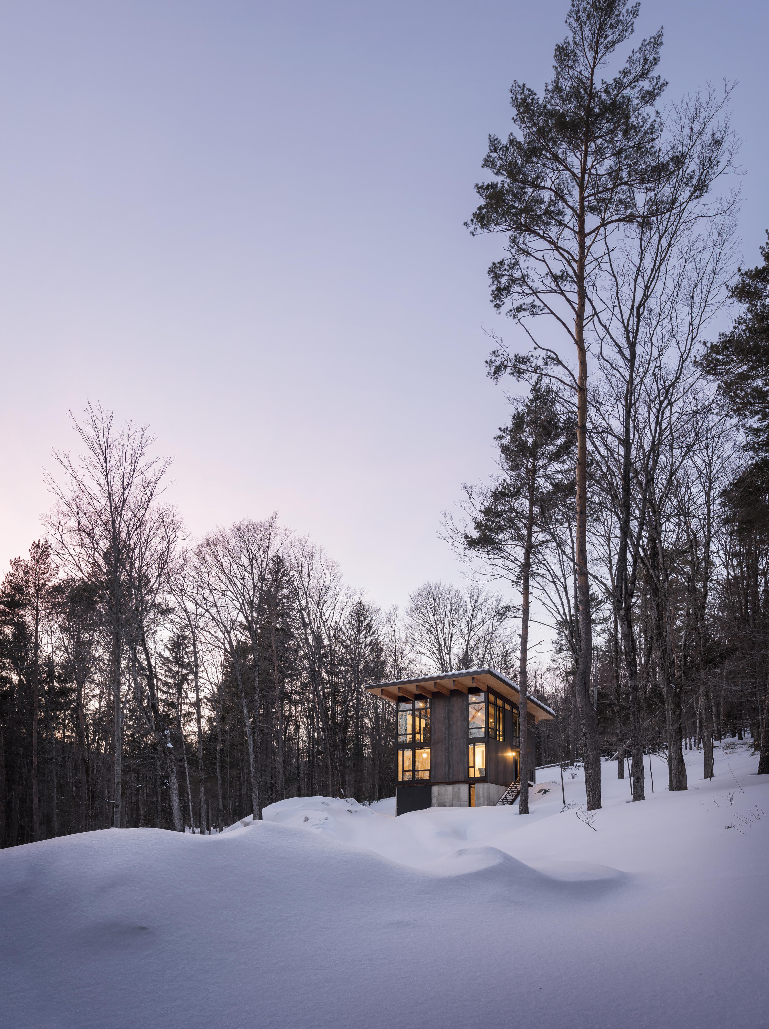 This compact cabin in rural Vermont emerges from its hillside site, rising into the white pines and maples to establish an intimate gathering place in the trees. Intended to bring family members closer to one another and to the forests of central Vermont, where the family has owned land for generations, the cabin’s 750-square-foot footprint is an efficient and economical framework for the family to experience the heavily wooded landscape. An elemental material palette of steel, wood and concrete draws inspiration from the untouched wilderness all around.