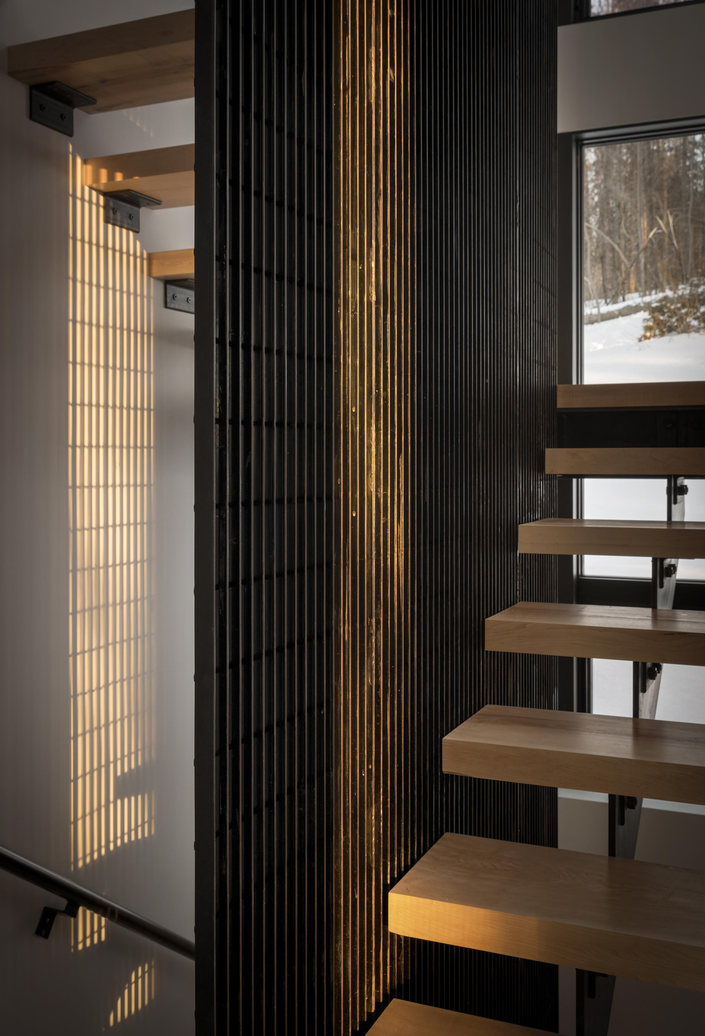 The cabin is composed of three levels: the lowest portion nestles into the site and contains a garage that doubles as a game room, as well as a single bedroom and powder room; the middle portion consists of the main entry, two small bedrooms and a bathroom; and the top level is one large living area. Locating the main living spaces on the upper level maximizes views of the Green Mountains to the west and the Worcester Range to the east. A single continuous stair of steel and maple hardwood connects all three levels.
