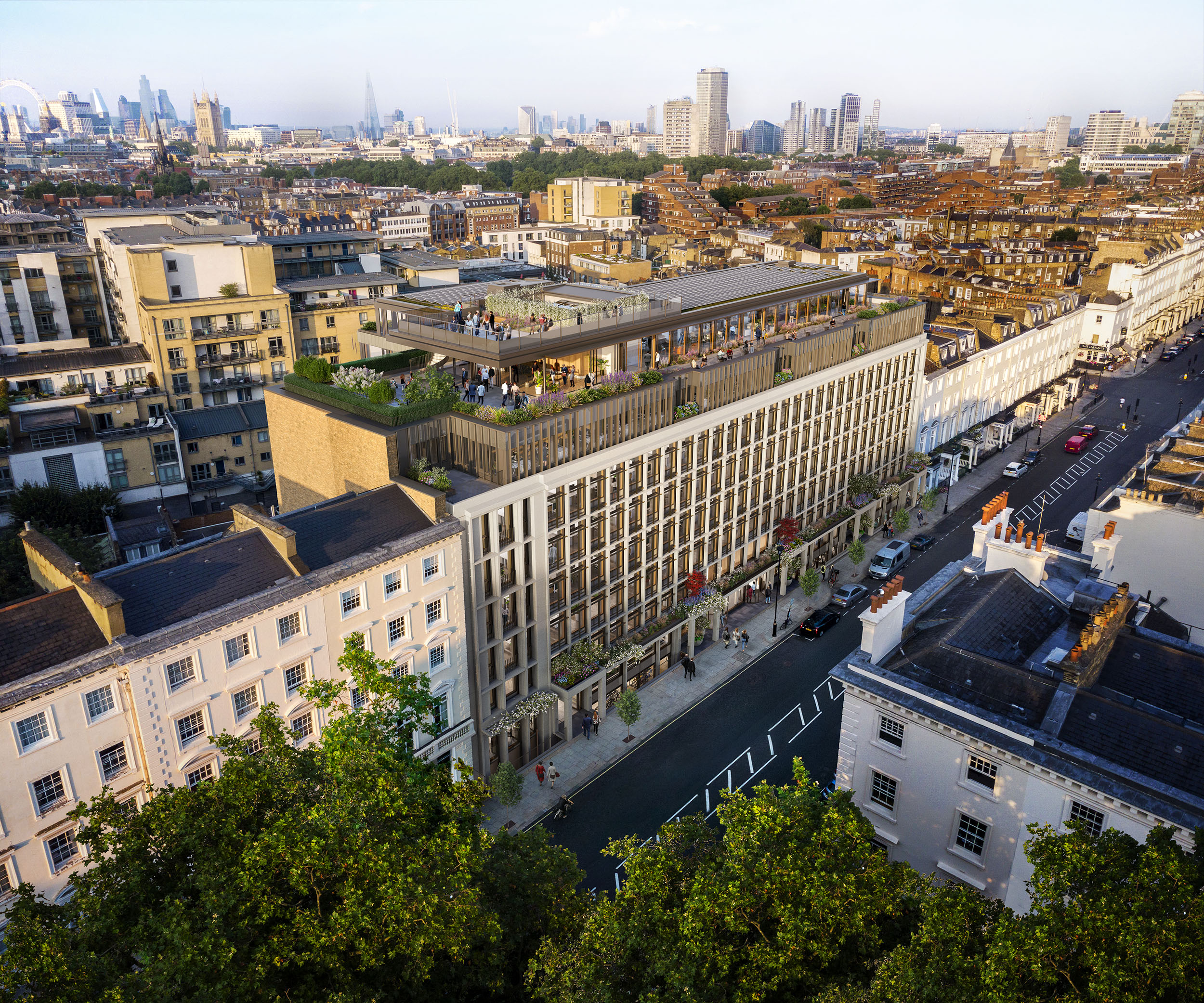 There is a 2,600 sq ft private garden at ground floor as well as spacious indoor and outdoor amenity spaces, a private terrace on the sixth and multiple terraces on the seventh floor, plus a rooftop platform offering 360-degree views over London. There will be storage for 178 bikes, 5-star spa-style changing rooms with 19 showers, and 177 smart lockers.
