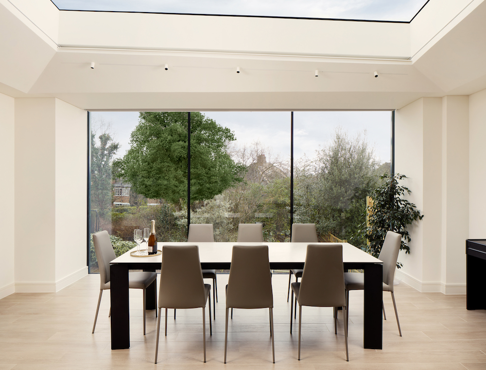 The tilted skylight above the dining room is angled to maximise the ingress of light. It was designed to have an integrated electric blind for moments when the sun would be too strong.